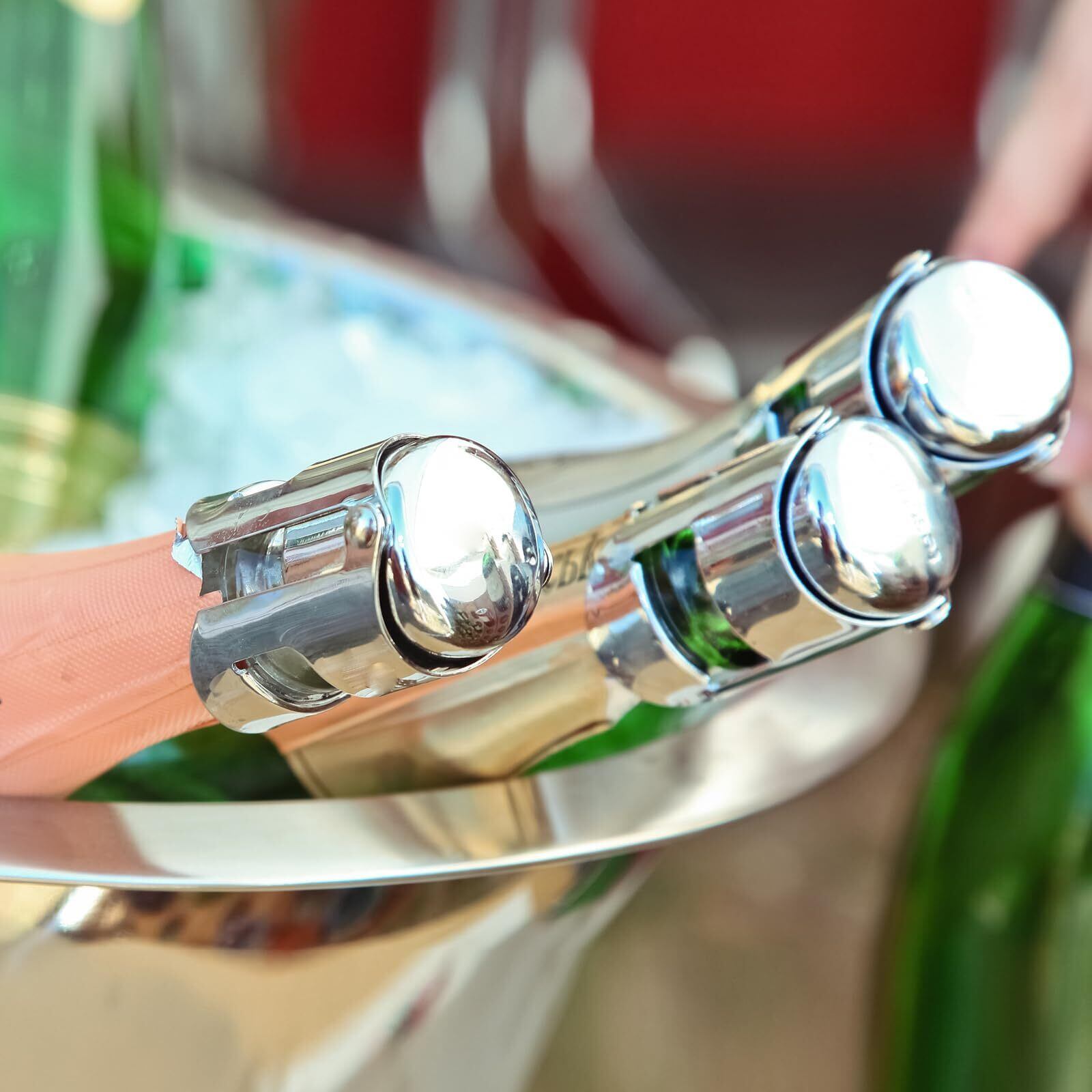 このシャンパン ボトル ストッパーは、ほとんどの標準的なシャンパン ボトルに適合します。シャンパンやスパークリングにもお使いいただけます。ストッパーは冷水で洗い流すだけで再利用可能です。