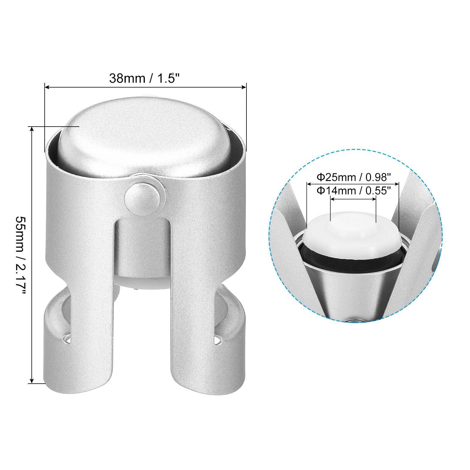 カラー:シルバートーン; 材質:ステンレススチール、シリコン; ストッパー直径:38mm/1.5"; 底の直径:25mm/0.98"; 小ストッパーキャップ直径:14mm/0.55"; 高さ:55mm/2.17"; シャンパンストッパー2個