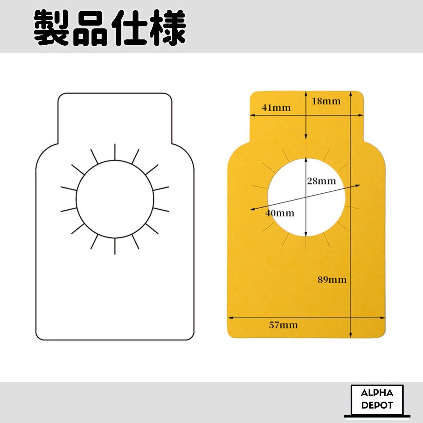 【商品詳細】ラベル全体の高さ:89mm / ラベル全体の幅:57mm / 首かけ部の高さ:18mm / 首かけ部の幅:41mm / 内円直径(穴の内径):28mm / 外円直径(切れ込み含む最大径):40mm