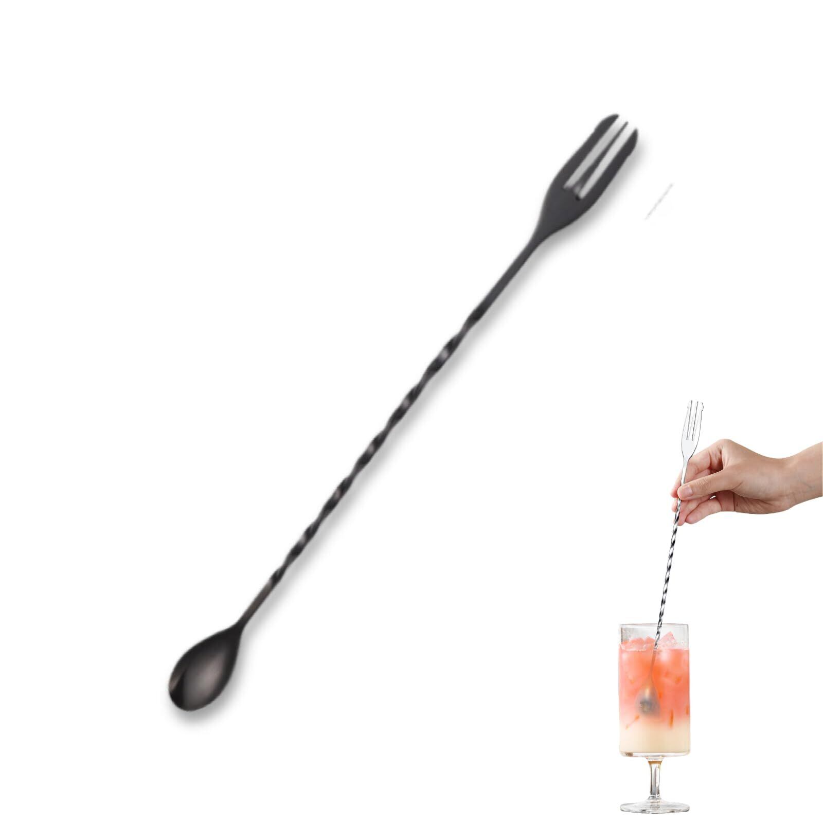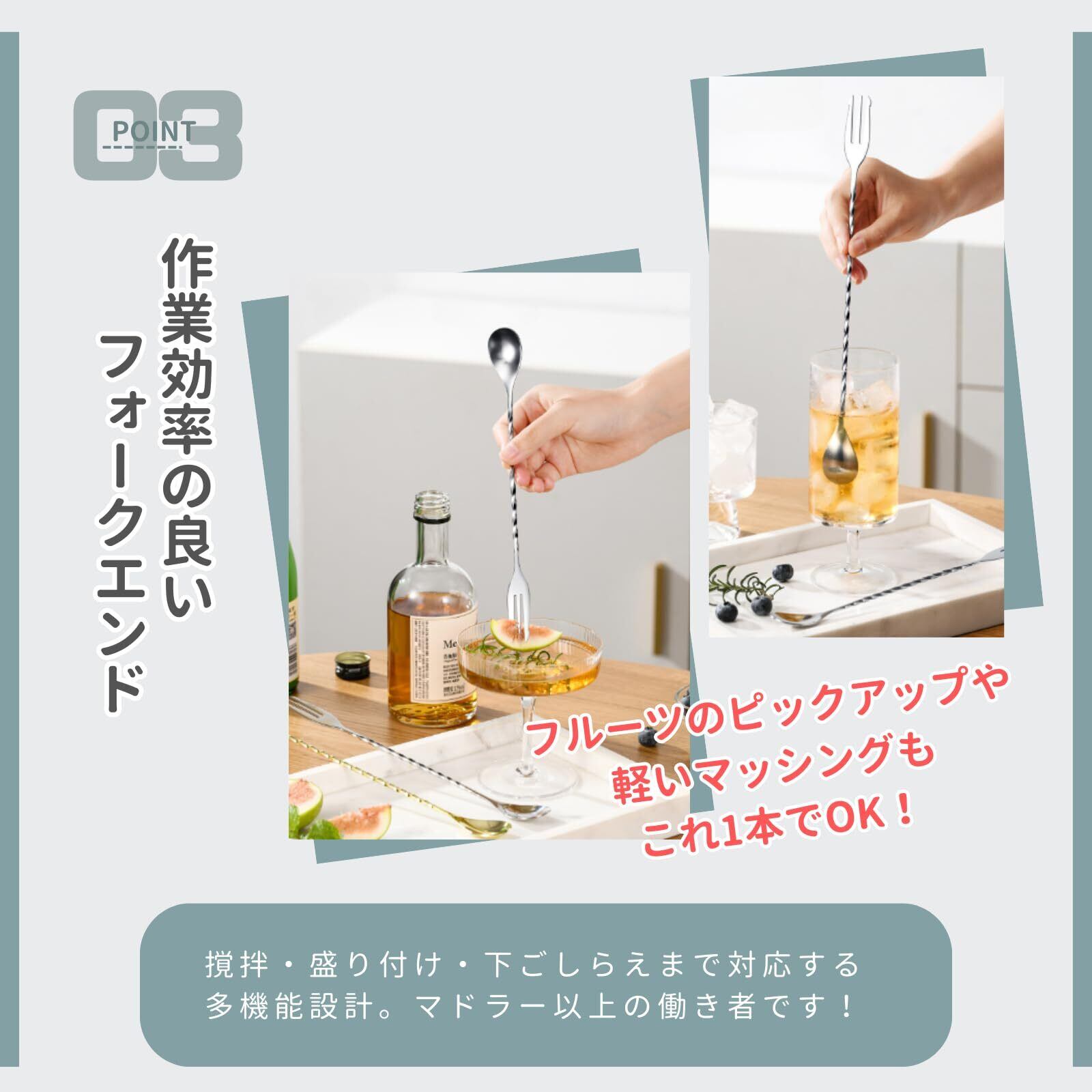 【多機能なフォークエンド】スプーンの反対側には便利なフォーク付き。カクテルのトッピング用フルーツのピックアップや、ミントの軽いマッシング、オリーブの取り出しなど多目的に使えます。撹拌だけでなく、サーブや下ごしらえにも活躍する実用的な設計が魅力。1本で複数の用途をカバーできるのが大きな特徴です。