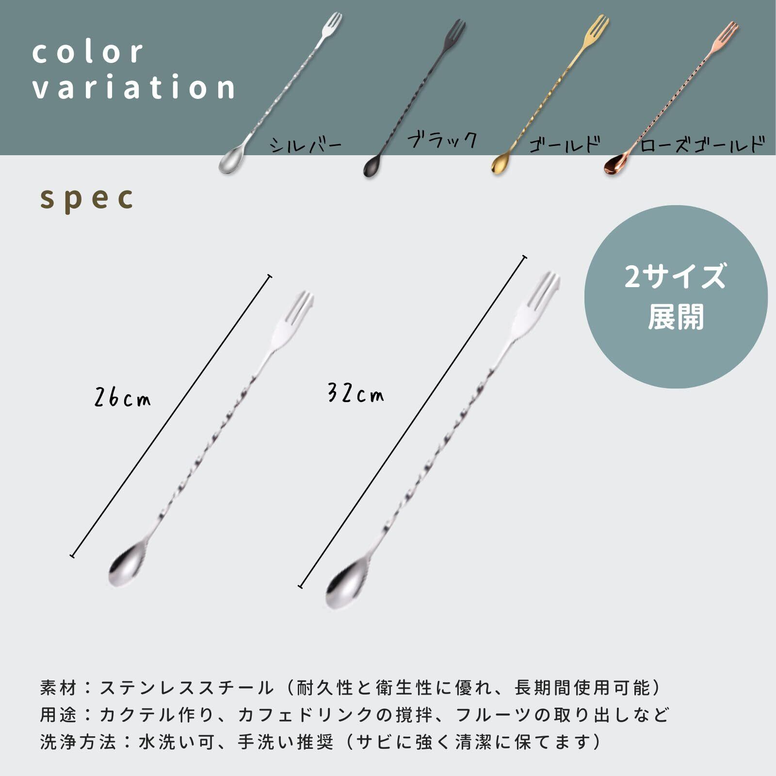 【商品詳細】サイズ:26cm / 32cm カラー:シルバー / ブラック / ゴールド / ローズゴールド 素材:ステンレススチール(耐久性と衛生性に優れ、長期間使用可能) 用途:カクテル作り、カフェドリンクの撹拌、フルーツの取り出しなど 洗浄方法:水洗い可、手洗い推奨(サビに強く清潔に保てます)