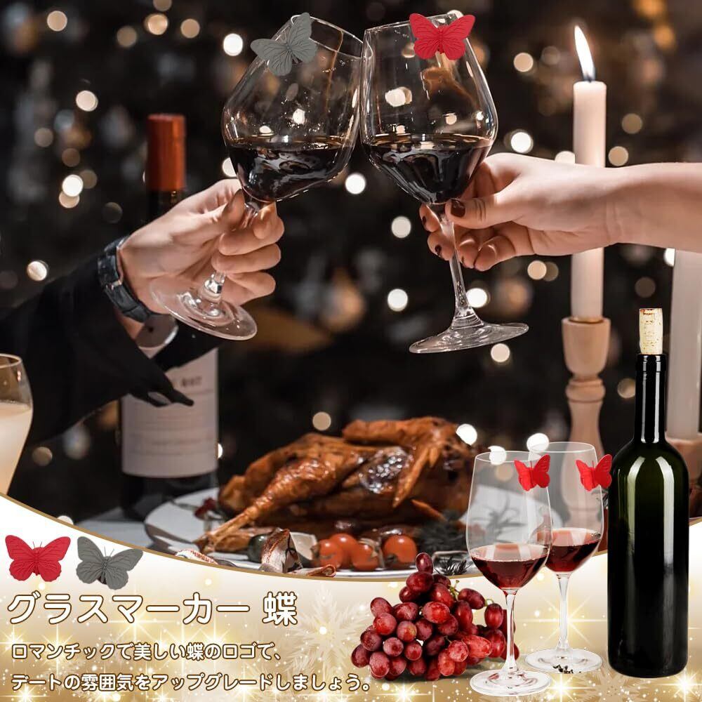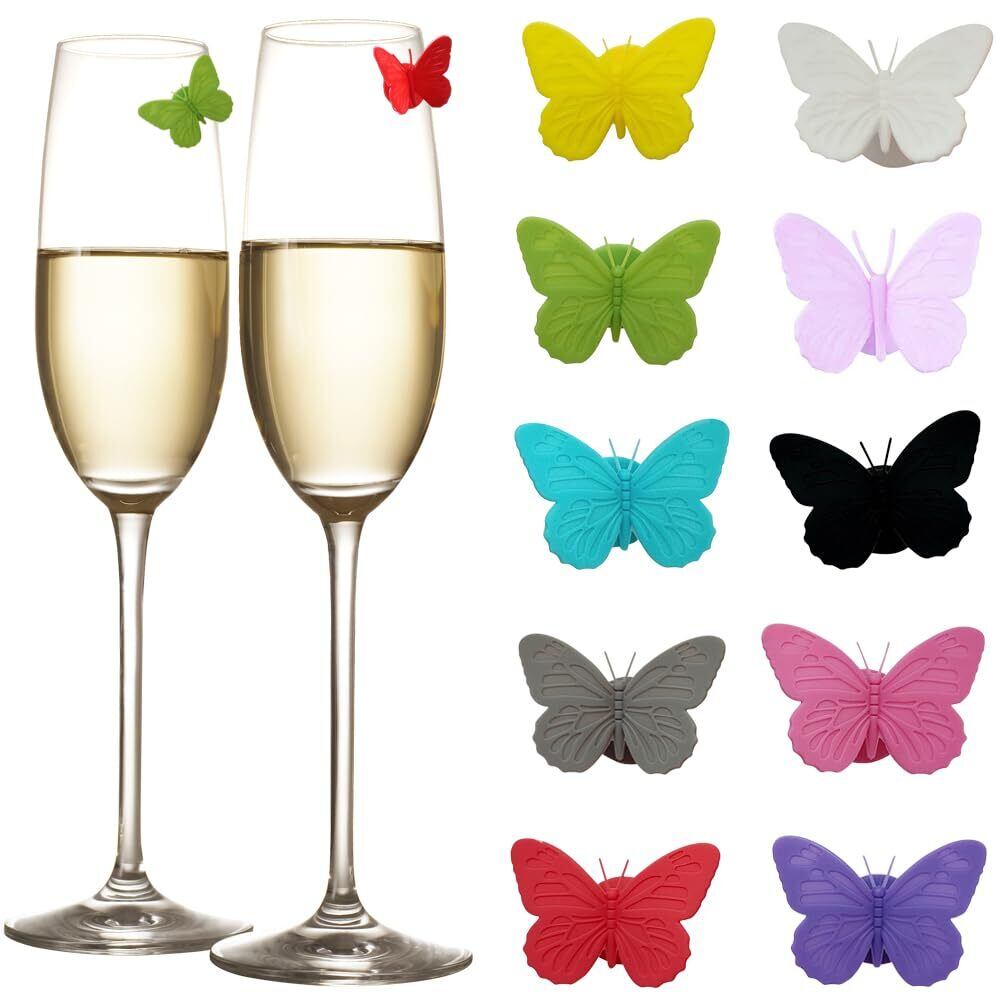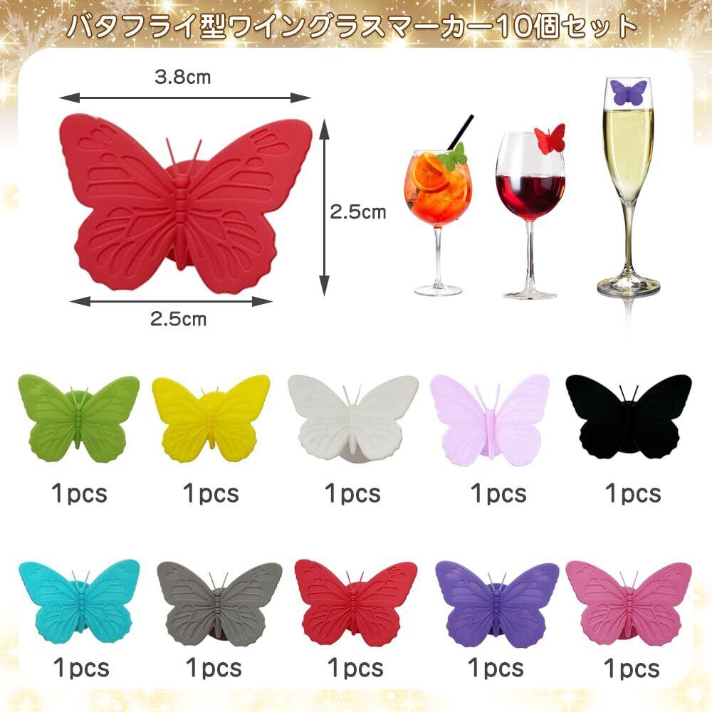 3Dシリコーン製バタフライワイングラスチャーム10個セット。シリコーンから成形された鮮やかな色のグラスステッカー10枚。パーティーに参加して、ゲストを魅了し、飲み物の取り違えを防ぎます。 各ゲストにワイングラスマーカーを取り付け、夜の終わりにパーティーの記念品に変身させましょう。
