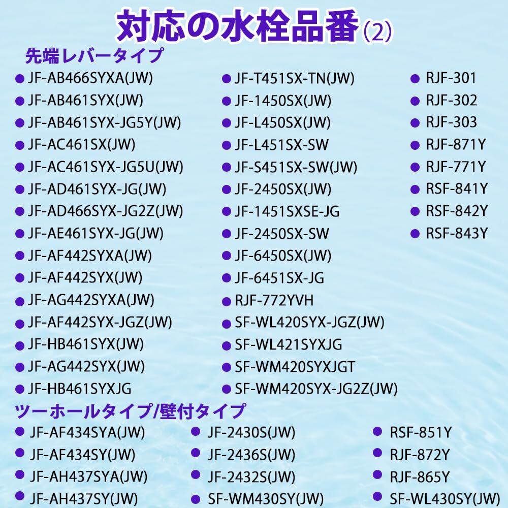 【適合水栓の型番①】JF-1456SYX、JF-1450SX/SE(JW)、JF-1451SYX、JF-1451SX(JW)、JF-1451SX/SE(JW)、JF-1460SX(JW)、JF2450SXK、JF2450SXNK、JF2450SXN-TO/SA。ツーホールタイプ/壁付タイプ: JF-AF434SYA(JW)、JF-2430S(JW)、JF-AF434SY(JW)、JF-2436S(JW)、RSF-851Y、SF-WM430SY(JW)、RJF-872Y、SF-WL430SY(JW)、JF-AH437SYA(JW)、JF-AH437SY(JW)、JF-2432S(JW)、RJF-865Y。