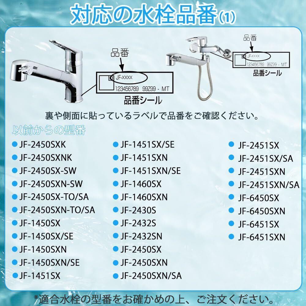 【適合水栓の以前からの型番】JF-2450SXK、JF-2450SXNK、JF-2450SX-SW、JF-2450SXN-SW、JF-2450SX-TO/SA、JF-2450SXN-TO/SA、JF-1450SX、JF-1450SX/SE、JF-1450SXN、JF-1450SXN/SE JF-1451SX、JF-1451SX/SE、JF-1451SXN、JF-1451SXN/SE、JF-1460SX、JF-1460SXN、JF-2430S、JF-2432S、JF-2432SN、JF-2450SX、JF-2450SXN、JF-2450SXN/SA、JF-2451SX、JF-2451SX/SA、JF-2451SXN、JF-2451SXN/SA、JF-6450SX、JF-6450SXN、JF-6451SX、JF-6451SXN。