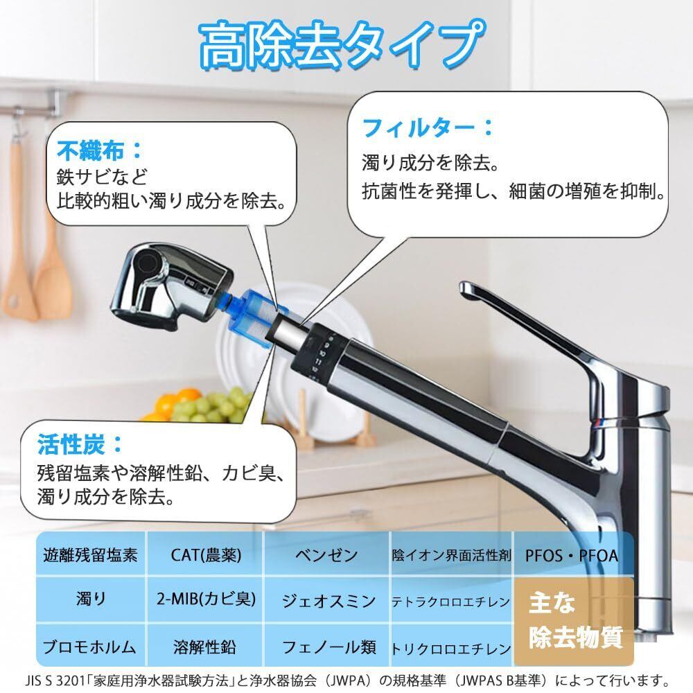 【12+1物質高除去】遊離残留塩素(カルキ)、PFOS/PFOA、濁り、溶解性鉛、2-MIB(カビ臭)、CAT(農薬)、ブロモホルム、テトラクロロエチレン、トリクロロエチレン、ベンゼン、ジェオスミン、陰イオン界面活性剤、フェノール類などの物質を除去、水道水を綺麗で美味しい水に変えます。