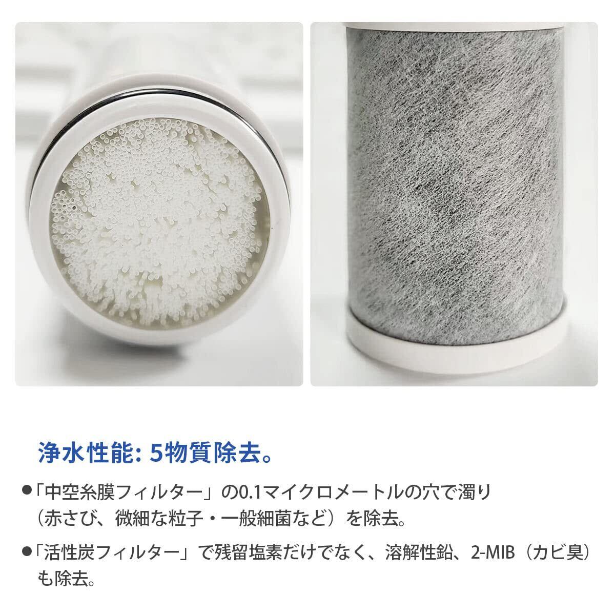 【5物質除去】廃棄時の環境への負担が少ない、フィルターコア1本当たりの水流量1200L最高除去率95%、5種類の物質を除去可能。遊離残留塩素、濁り、CAT、2-MIBカビ臭、溶解性鉛 【ろ材の種類】 中空糸膜、イオン交換繊維、活性炭、不織布 ※PFOS、PFOAも除去できることを確認しています。