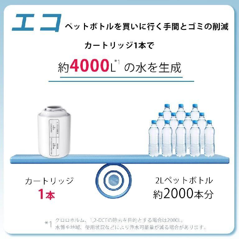 【1年簡単交換の長寿命タイプ】カートリッジ1本あたりの浄水容量は約4000リットルで、2Lペットボトルの2000本分に相当します。交換目安は約1年ですが、水質や地域、使用状況などにより浄水可能量が減り、交換時期より早めの場合があります。交換はワンタッチで簡単にできます。