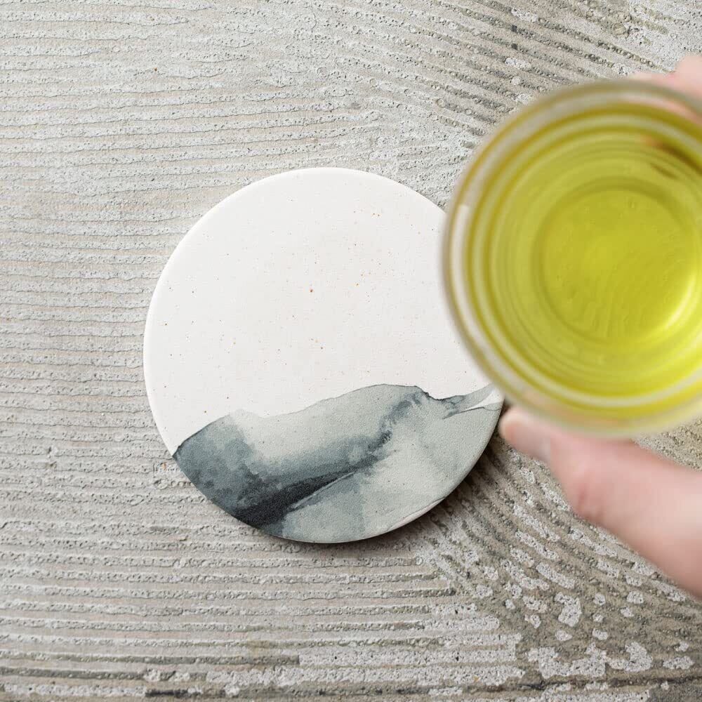 大人っぽい水彩・水墨のグラデーションやにじみを楽しむシリーズ。珪藻土の持つ優れた吸水性で、グラス表面にできる水滴をすばやく吸い取ってくれます。お手入れの手間もかからない、使い心地の良いコースターです。