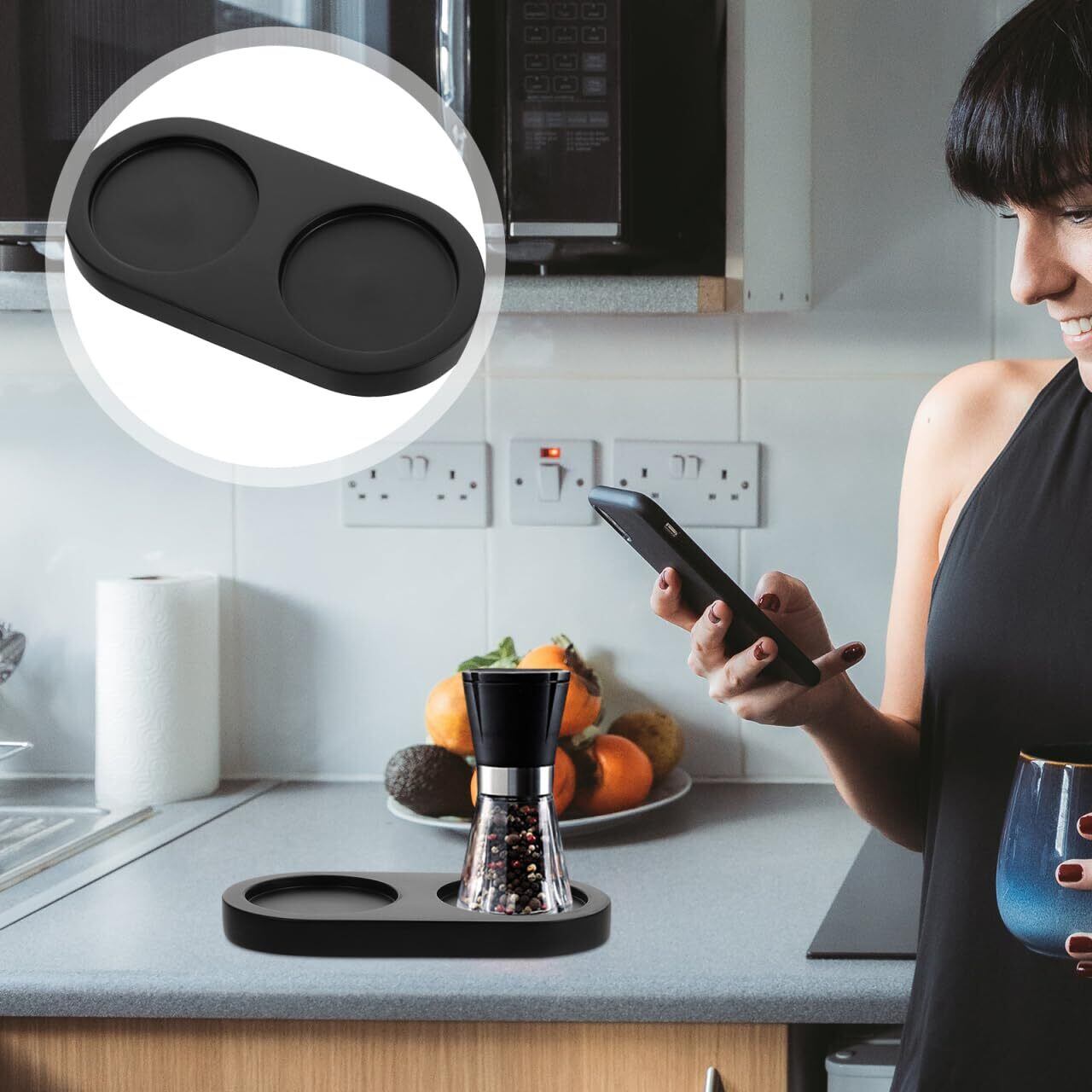 【振動吸収】: ペッパーミルトレイは高密度材質が研磨中の振動や音を効果的に吸収し、静かな料理環境を実現します。
