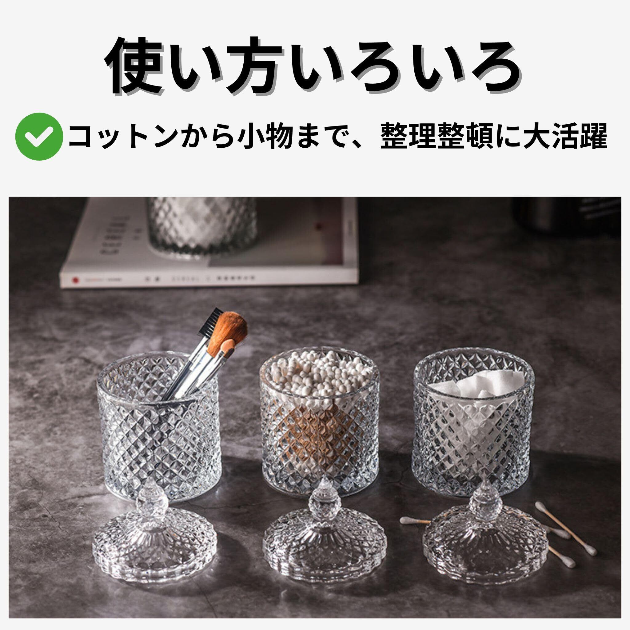 (幅広い用途に対応)このガラス小物入れは、コットン入れ、綿棒入れ、爪楊枝入れとして活用できるだけでなく、キャンディやお菓子の収納、さらにはコンタクトケースやアクセサリー収納にも最適です。透明ケースなので、中身が見やすく、整理整頓が楽に行えます。