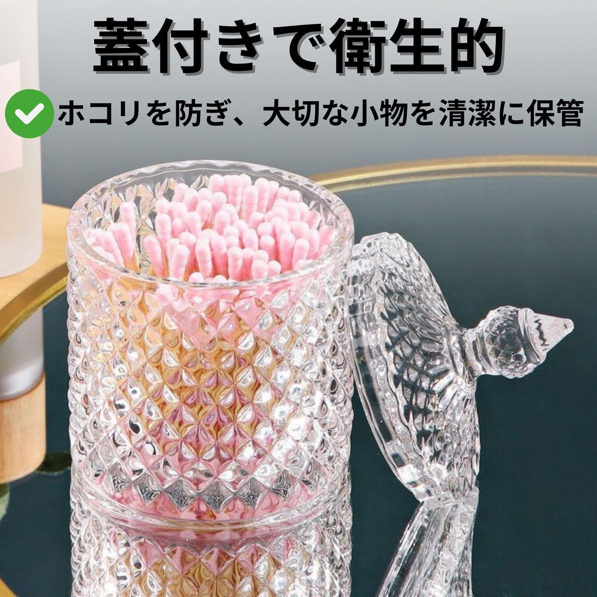 (フタ付きで安心&衛生的)フタ付きのデザインが、ホコリや湿気から大切なアイテムをしっかり保護。綿棒やコットンを清潔に保つことができ、特に衛生面を重視する家庭や店舗におすすめです。フタはスムーズに開閉できるため、使い勝手も抜群。コンパクトながら収納力があり、置き場所にも困りません。