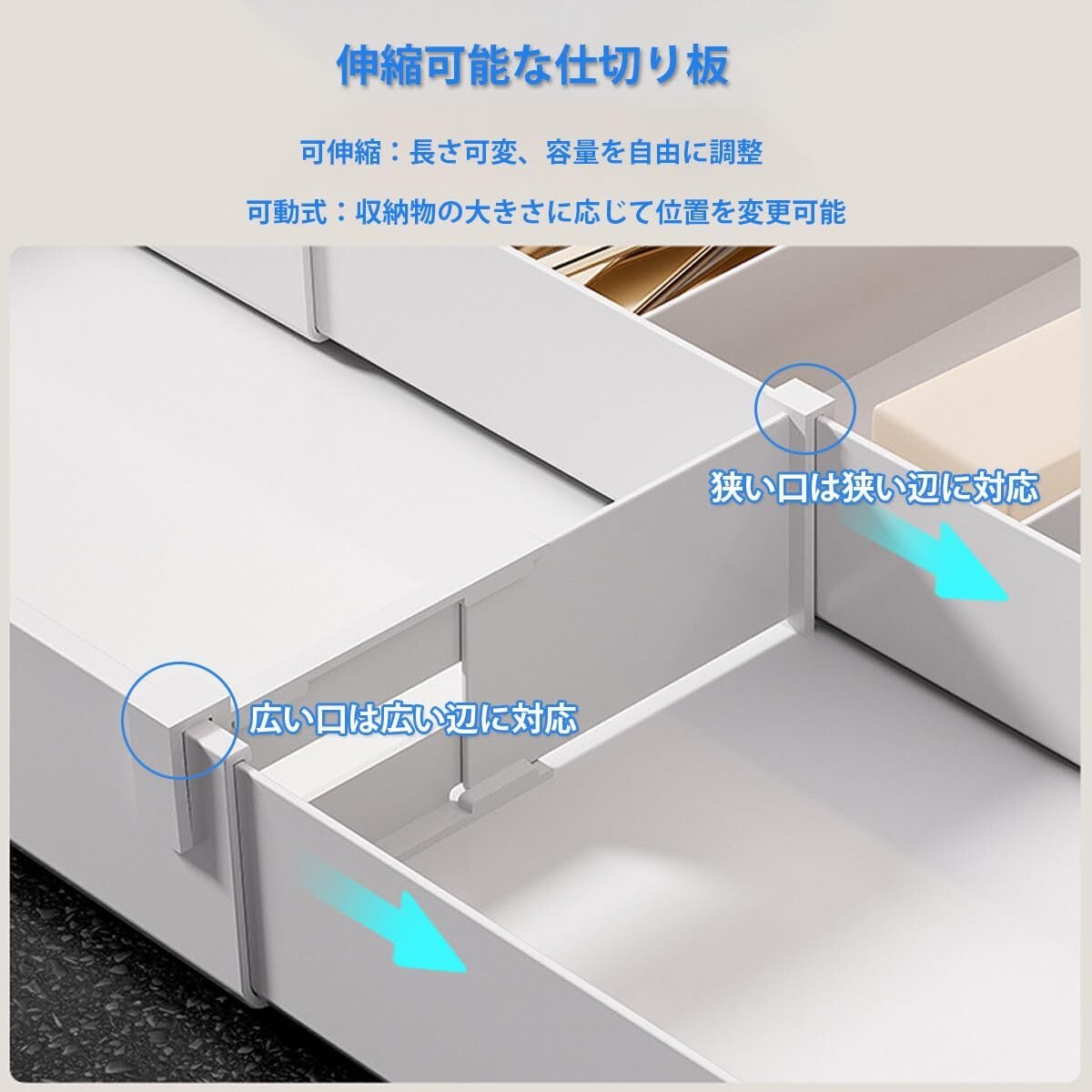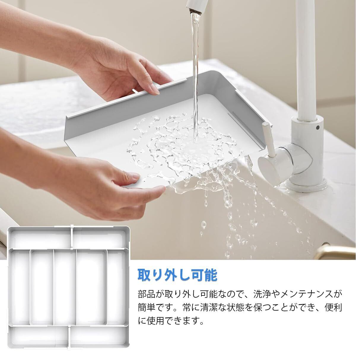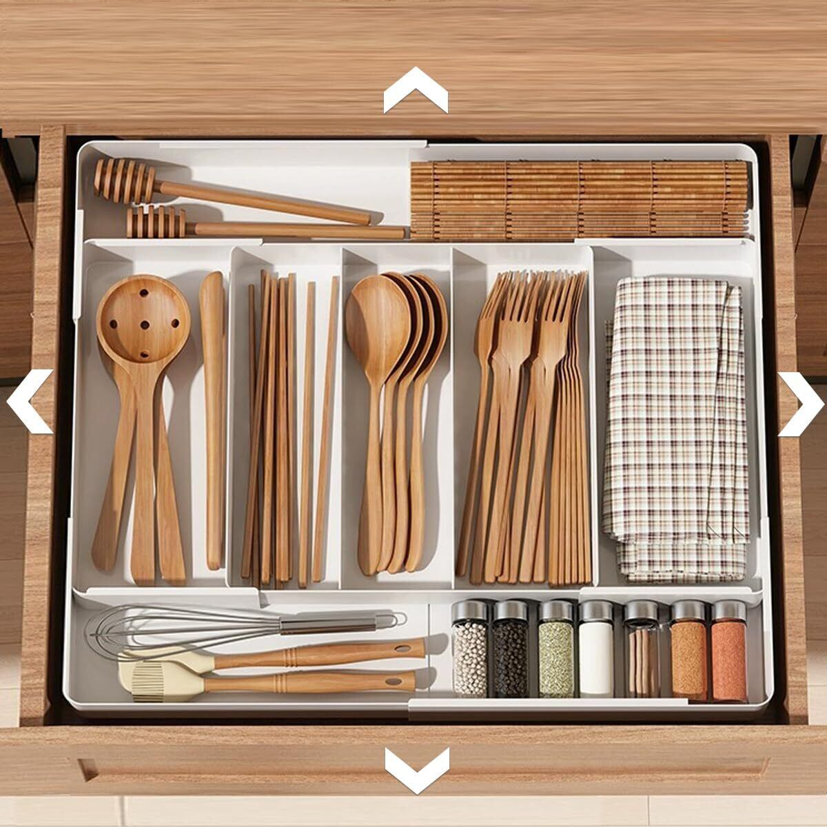 【4方向への伸縮カトラリーケース 】4方向にも自由に調整できるため、引き出しや収納スペースに完璧にフィットさせることができます。これにより、スペースを無駄にすることなく効率的に収納できます。
