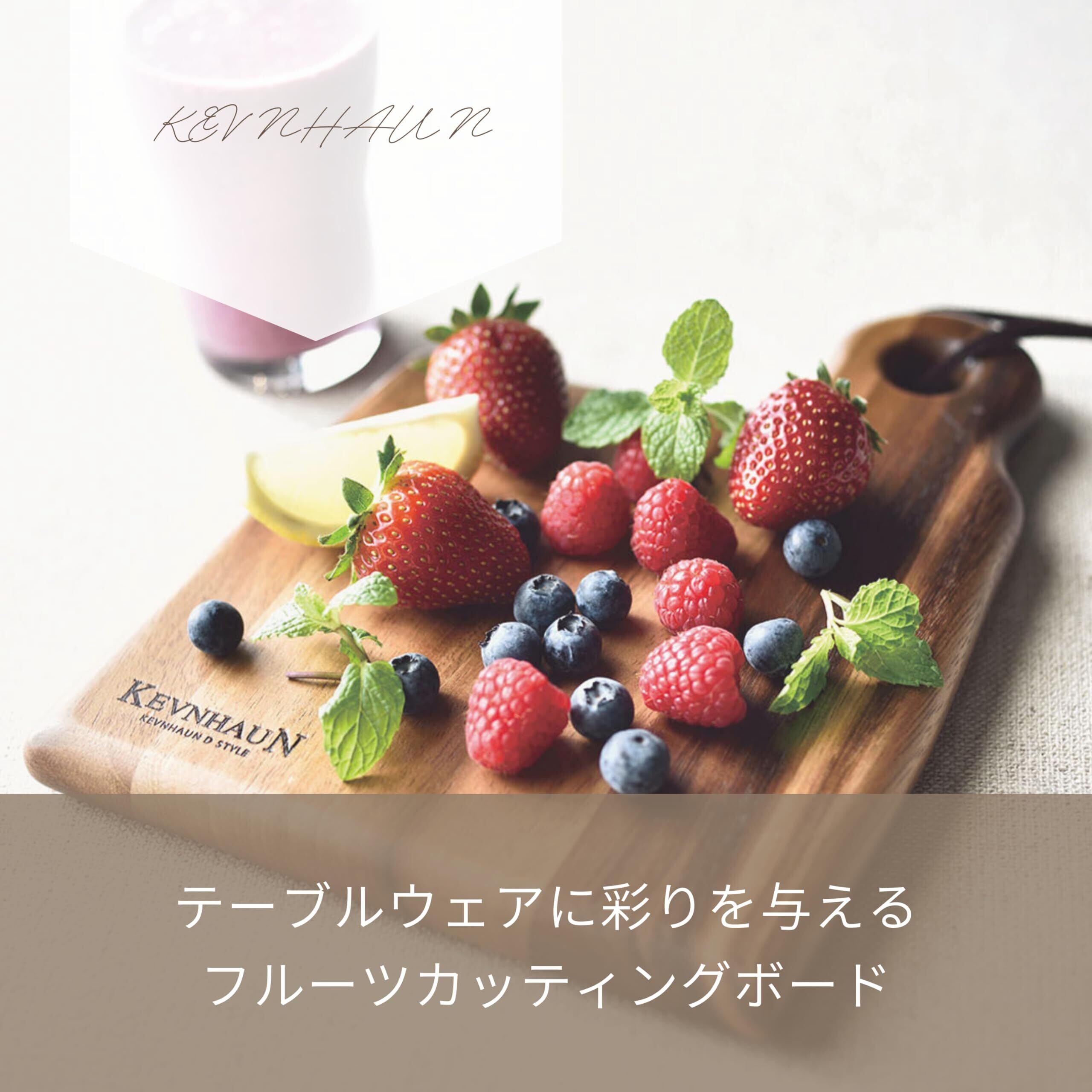 使い込むほど天然木の味わいが増し、KEVNHAUNフルーツカッティングボードは、キッチンに立てかけておく姿にも存在感があります。カットするだけでなくオードブルを盛りつけて食卓に出しても素敵です。とても扱いやすいサイズなので、プレゼントにしても喜ばれるでしょう。