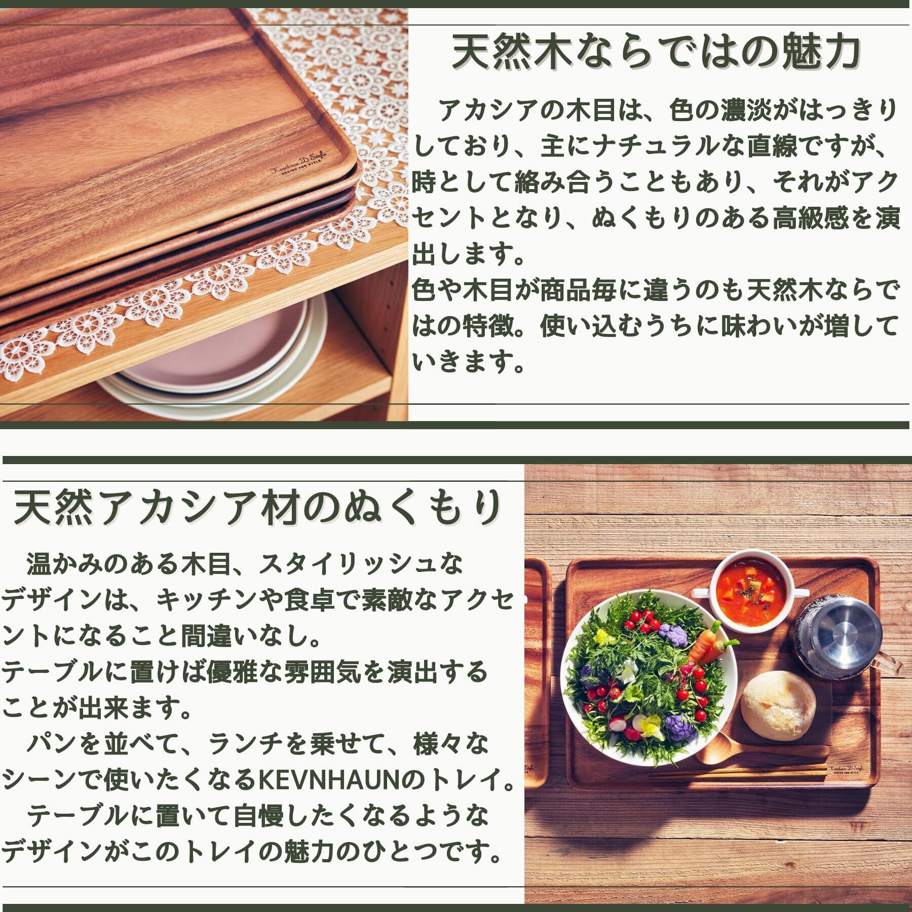 天然アカシア材のぬくもり:温かみのある木目、スタイリッシュな格子柄のデザインは、キッチンや食卓で素敵なアクセントになること間違いなし。テーブルに置けば優雅な雰囲気を演出することができます。パンを並べたり、ランチをのせてみたり、いろいろなシーンで使いたくなるKEVNHAUNのトレイ。テーブルん置いて自慢したくなるようなデザインがこのトレイの魅力のひとつです。ひとつとして同じものがない木目も天然木の良さでもあります。
