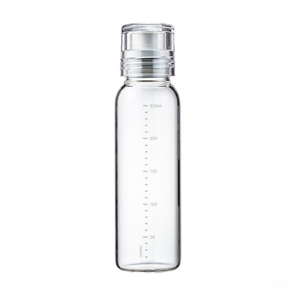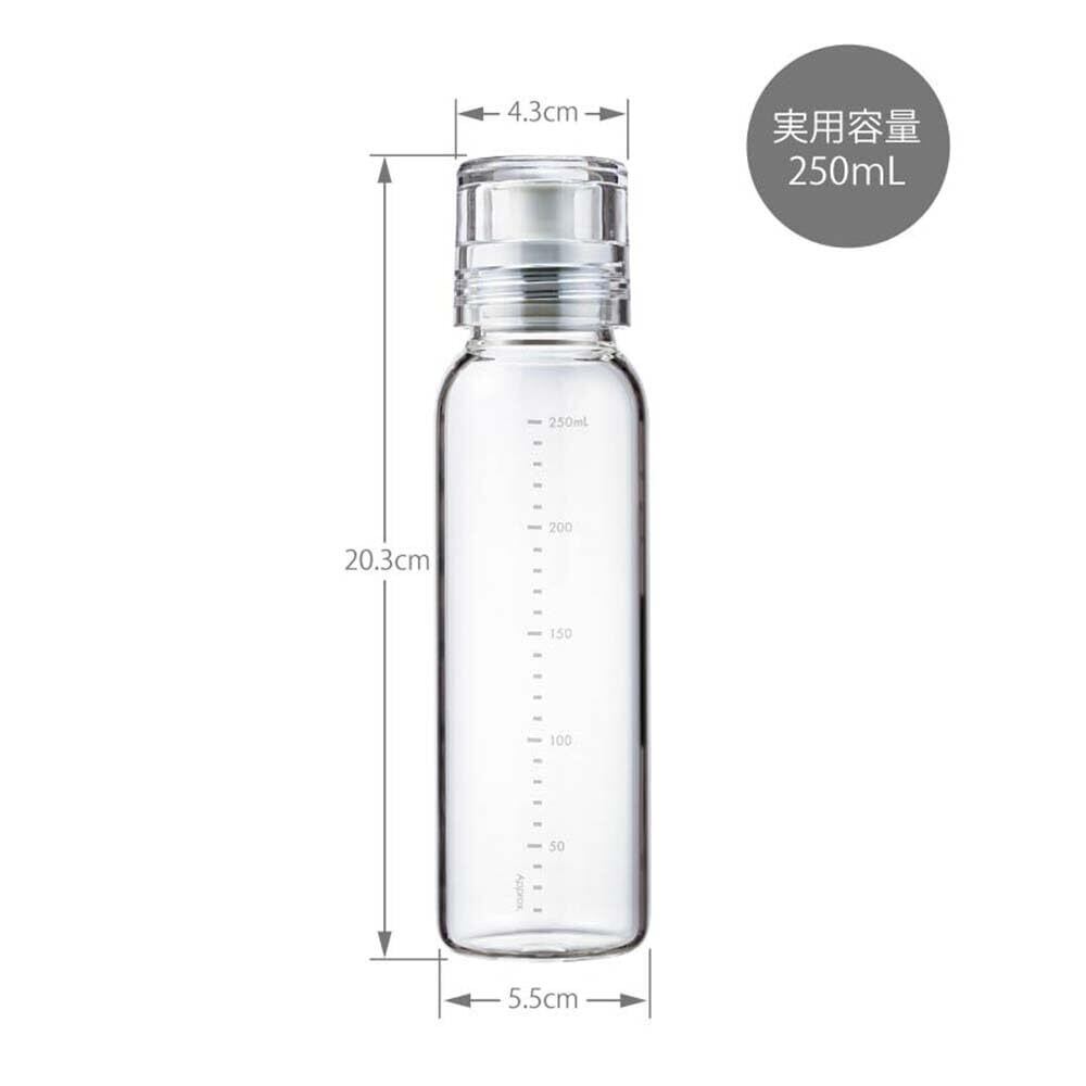 【商品詳細】本体サイズ:幅5.5×奥行5.5×高さ20.3・口径3.7cm、本体重量:約237g、実用容量:250mL、本体材質:本体/耐熱ガラス・フタ/PCT樹脂・注ぎ口/シリコーンゴム