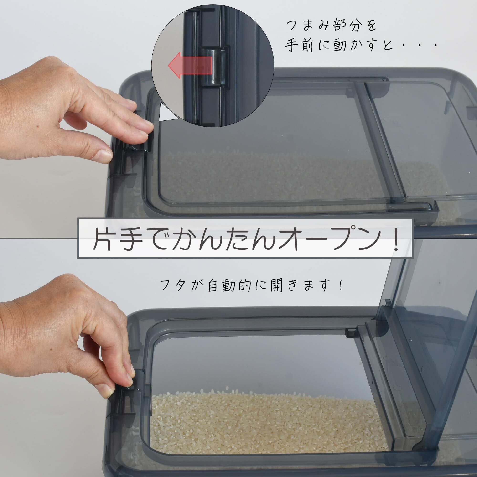 ■計量カップ付きで片手で簡単に開閉できるコンパクトなお米ケース。