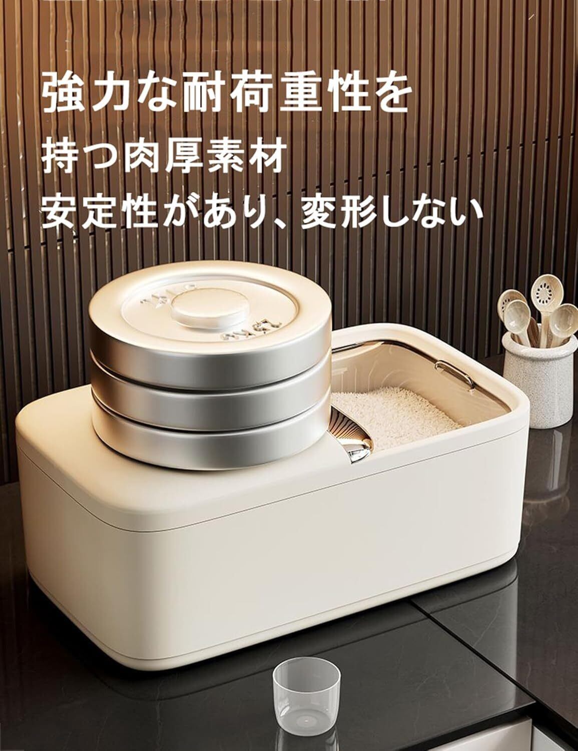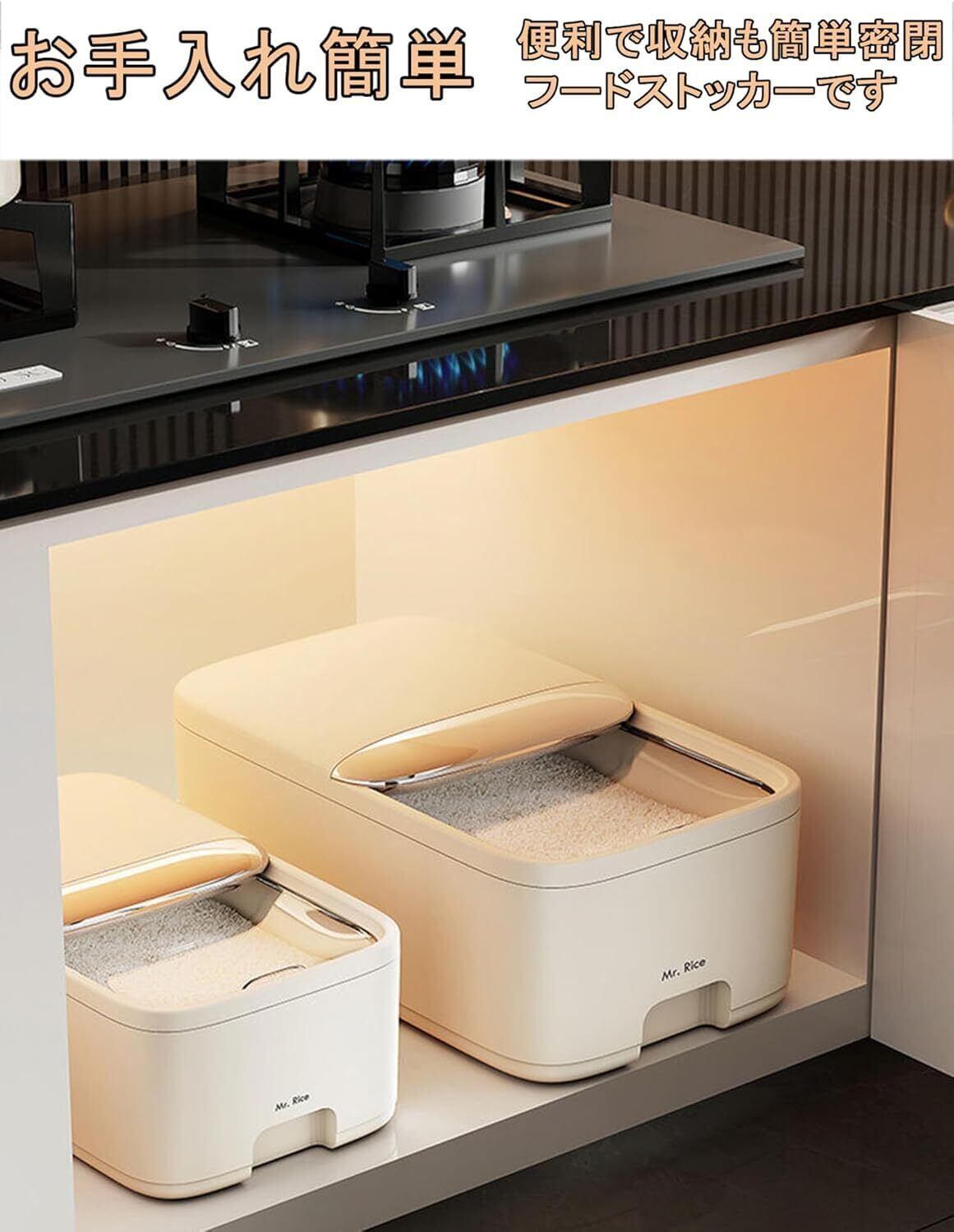【多機能貯蔵物】乾物、米、砂糖、塩、豆類、小雑穀、小麦粉、間食、ナッツ、ベイク用品などの食品を保管することができる。コーヒー豆やキャットフード、ドッグフードなどのストックにも最適