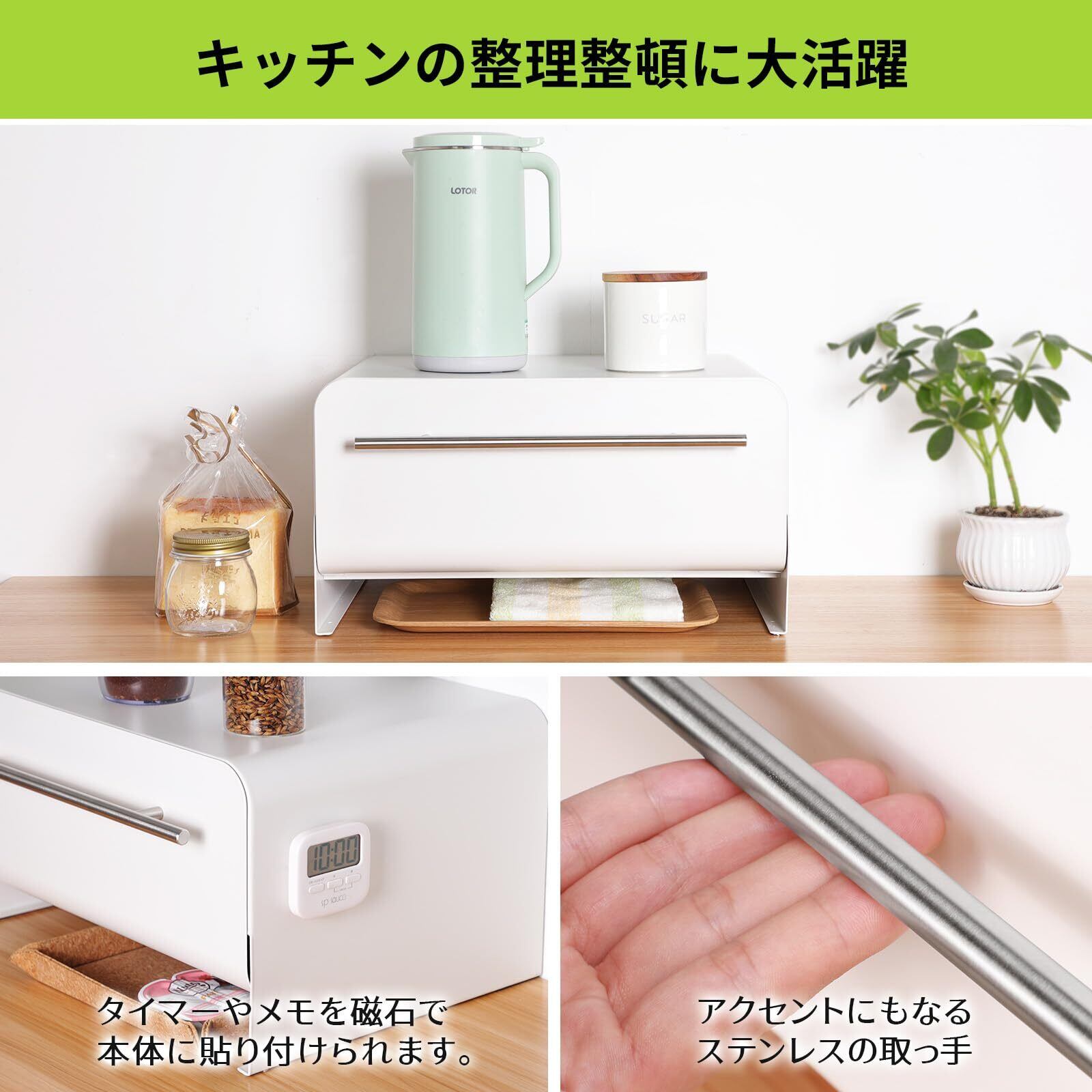 FUNHOO ブレッドケース 引き出し式 ブレッドドロワー 白 トースターラック 大容量 小物収納 約横43×奥行32×高さ23.5cm おしゃれ シンプル ブレッドボックス ストッカー 隠す収納 すっきり 整理整頓 キッチン収納 マグネット トースター台