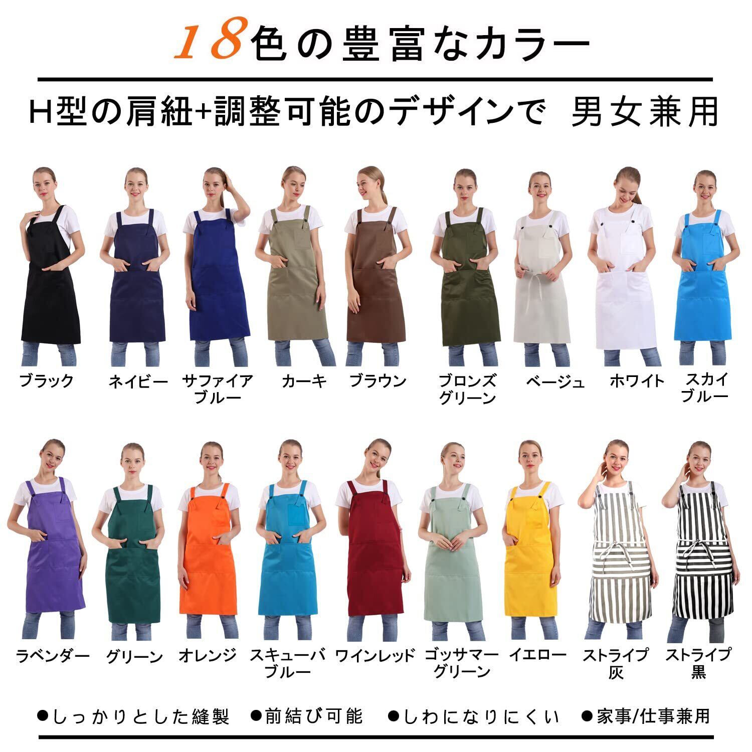 着脱が楽な肩掛けH型タイプなので長時間使用でも疲れにくい。首ひもは三段階の長さ調整が可能なタイプなので体型問わずに体にフィットし、動きやすいです。身丈は81㎝あり、身長155cm~190㎝の方々におすすめです。洗濯しても色落ちせず、シワにもなりにくいのでアイロンをかける必要もありません。