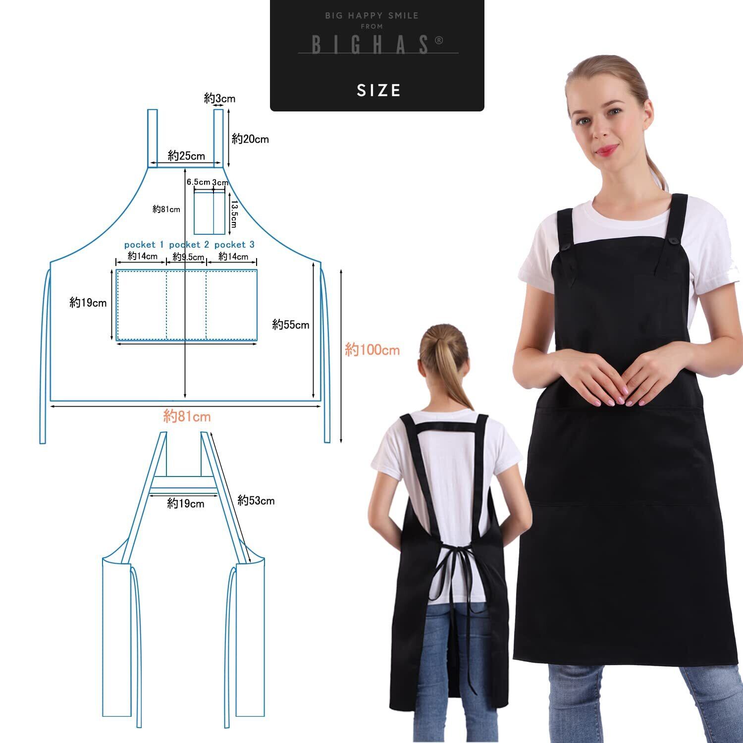 [BIGHAS] 肩掛け H型 エプロン シンプル 無地 大きいサイズ カフェエプロン 保育士 業務用 家庭用 作業用 料理 サイズ調整可能 おしゃれ