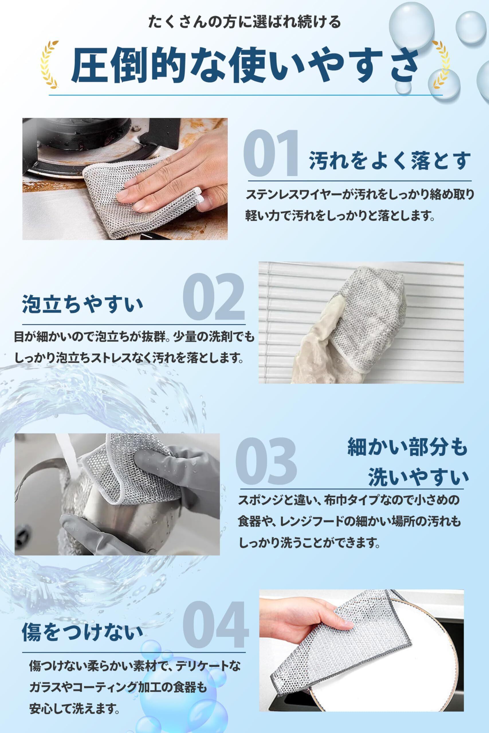 【頑固な油汚れもスッキリ!圧倒的な洗浄力】クロスのステンレスワイヤーがこべりついた油汚れをしっかり絡め取り、軽い力で汚れをしっかり落とします。