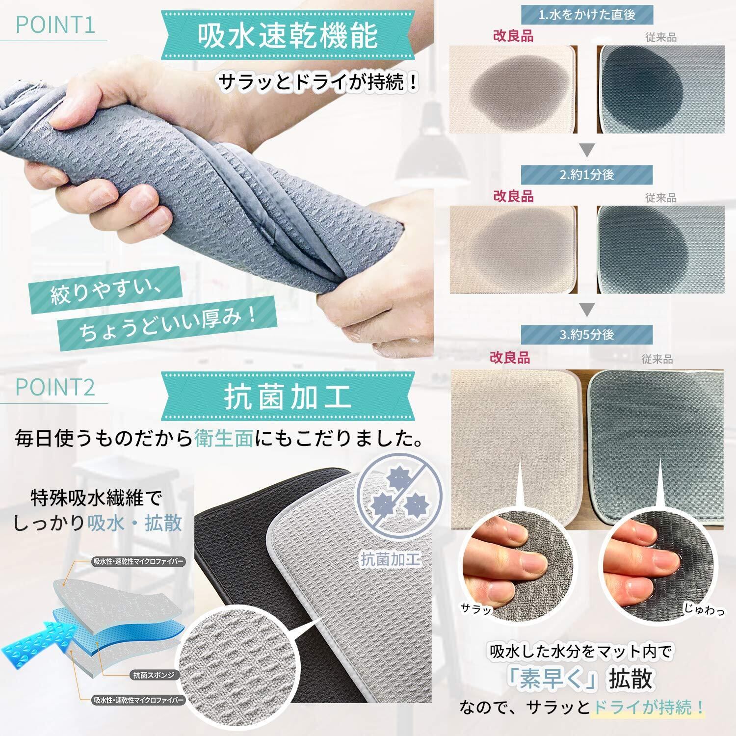 【<1>日本基準の防菌効果 】毎日使うものだから衛生面も徹底しました! 手洗い 洗濯機 乾燥機 もご使用できますので、繰り返し清潔に使える シンクマット です!【 <2> 吸水速乾性 30%アップ!】 吸水 した水分を素早くマット内に拡散!サラっとドライが持続!