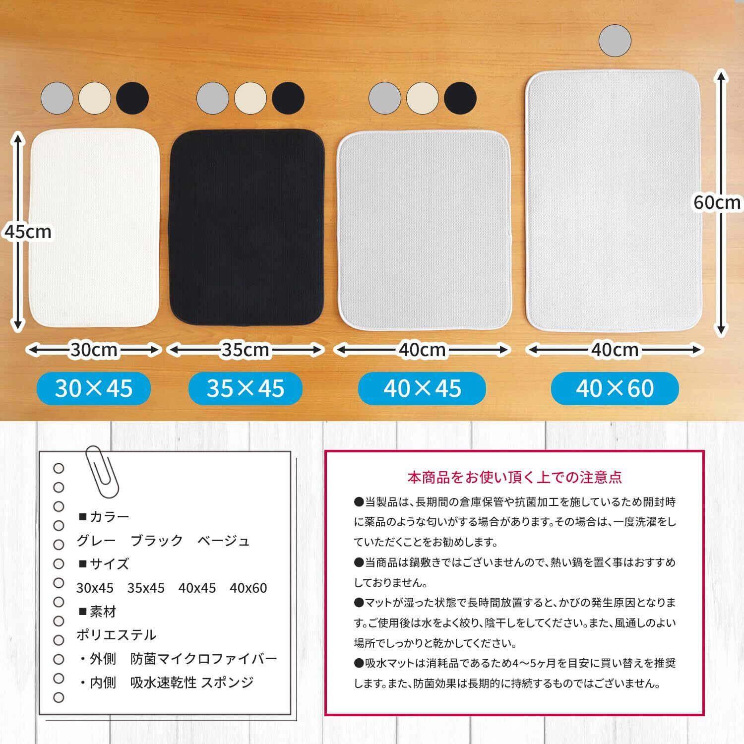 【 水切り マット 】 製品仕様 / サイズ:40 x 60cm / 40 x 45cm / 35 x 45cm / 30 x 45cm / カラー: グレー ブラック ベージュ 【 水切りマット に関するお問い合わせは、365日対応のヘルプデスクへ】ご使用前、ご使用後でもかまいませんのでサポートまで、お気軽にご連絡下さい。(お問い合わせはご注文履歴からかんたんにできます。)Please feel free to contact us for support for dish drying mat , dish drainer kitchen mat .