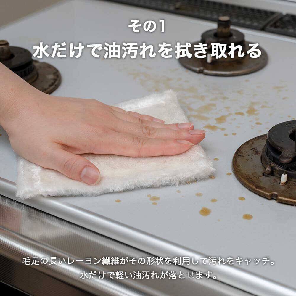 【油汚れをかきとる !】毛足の長いレーヨン繊維がその形状を利用して汚れをキャッチ。水だけで軽い油汚れが落とせます。台拭きとして、しょう油・ソースなどの食卓の汚れやレンジ・オーブンの油汚れなどにも使えます。