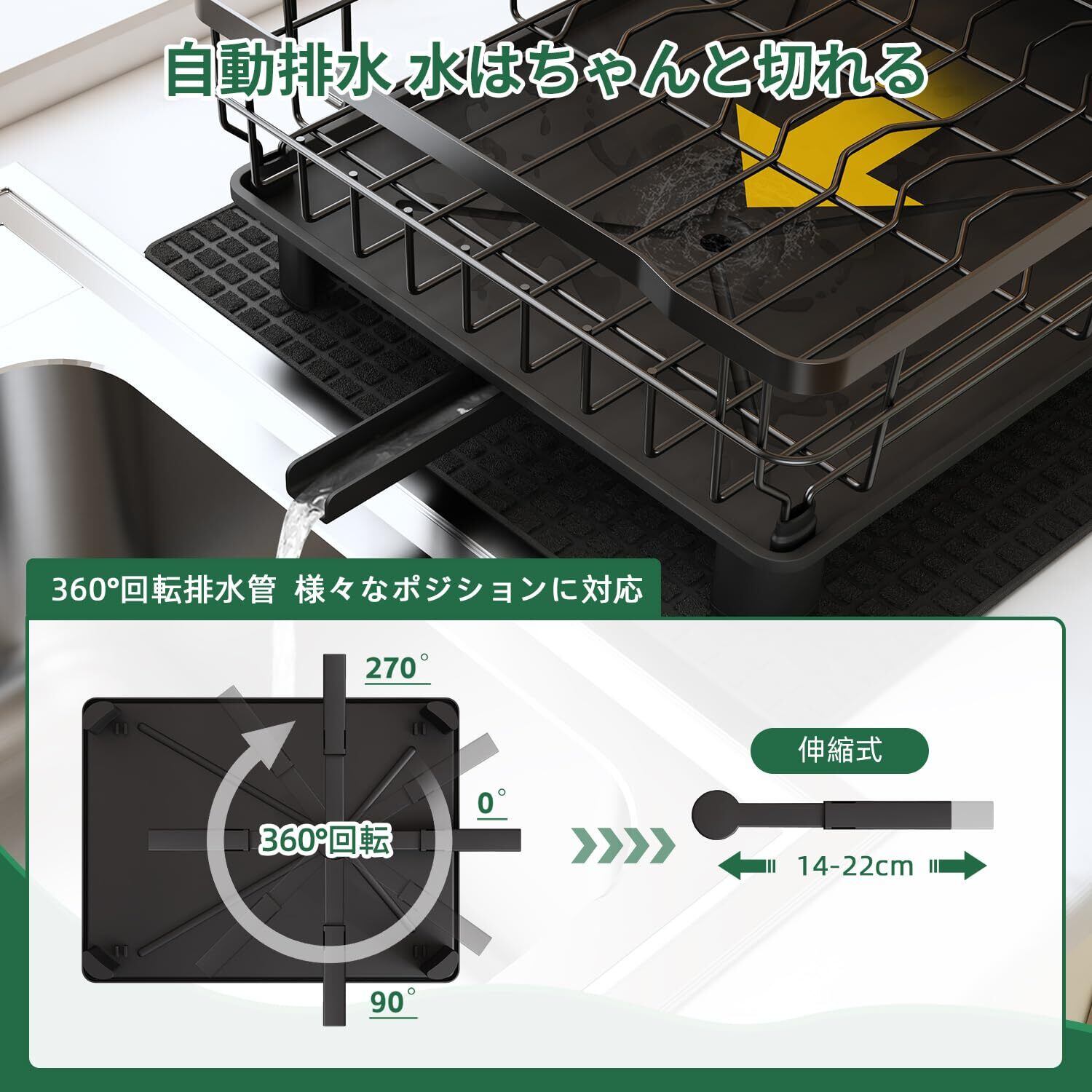 【自動排水&上段取り外し可能な設計】排水トレーの底は真ん中に排水パイプが接続され、排水パイプは360°回転でき、長さも調整できるので、排水トラブルとサヨナラでき、水が溜まるのを防ぎ、衛生を維持できます。水切りラックは2段式で、上段は取り外し可能です。単体でもシンクにも収納できてキッチンのスペースを有効に活用できます。