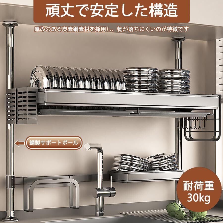 Zilnox 水切りラック シンク上 食器 水切り かご ラック 大容量 突っ張り つっぱり式 キッチン 省スペース 多機能収納 洗い物ラック 炭素鋼 グレー 幅78x奥行30.5x高66.5-105CM