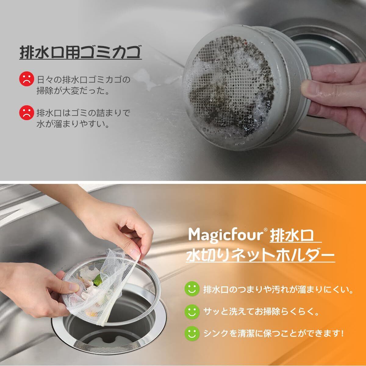 【掃除から解放】排水口 ゴミ受けはは、バスケットいらずに水切ネットを固定するだけで、日々の排水溝のゴミ受けの掃除の手間が省け、汚れ取りのストレスが解消してくれます。