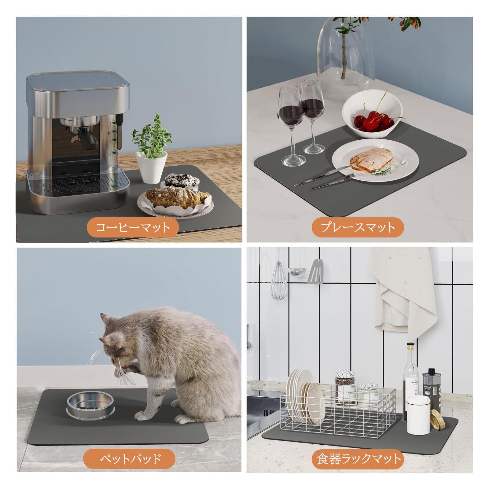 【多用途】水切りマットとして使用だけではなく、会社やお家のドリンクコーナーに置いて吸水マットとしてもオススメです。犬や猫のボウルの下に敷くマットとしても使用できます。