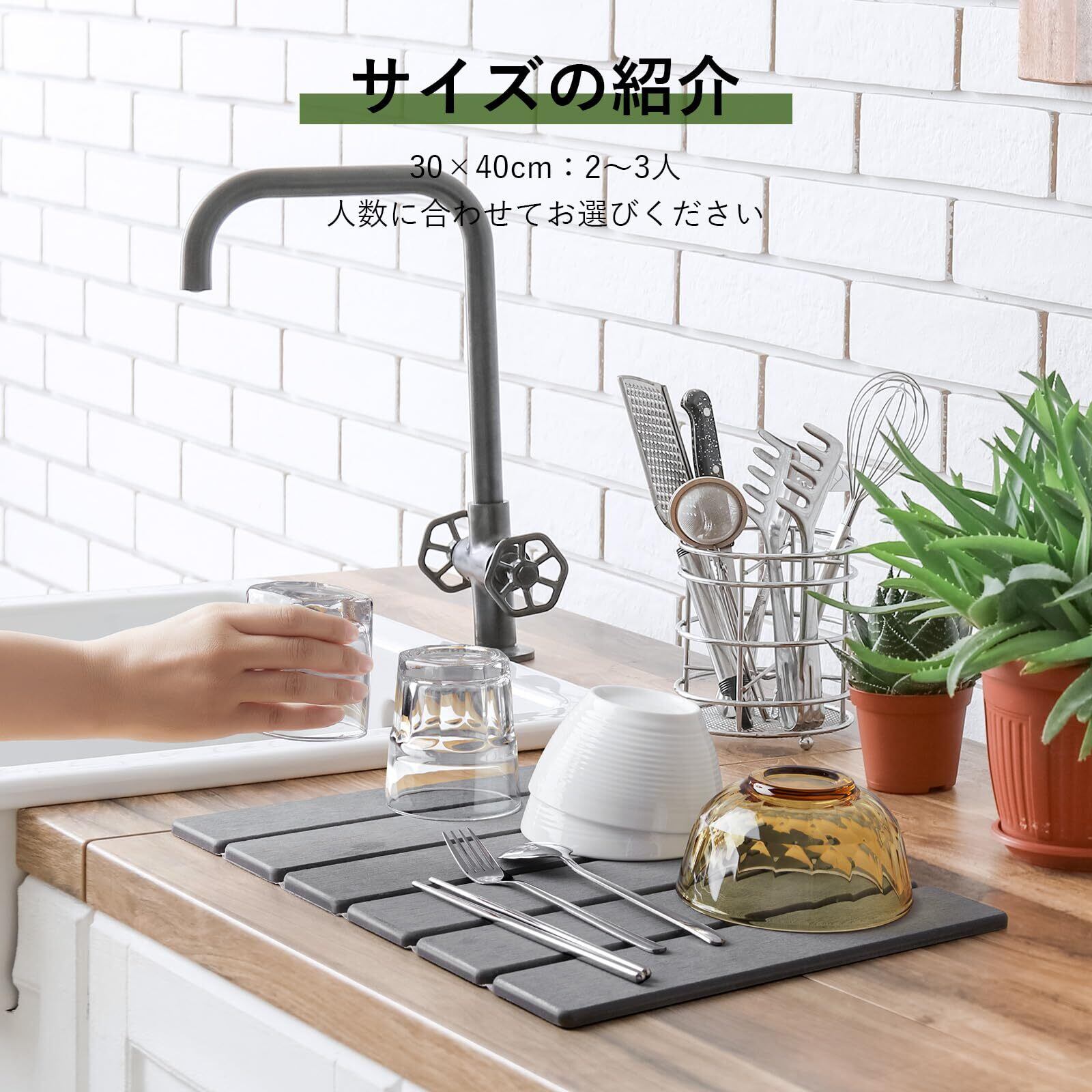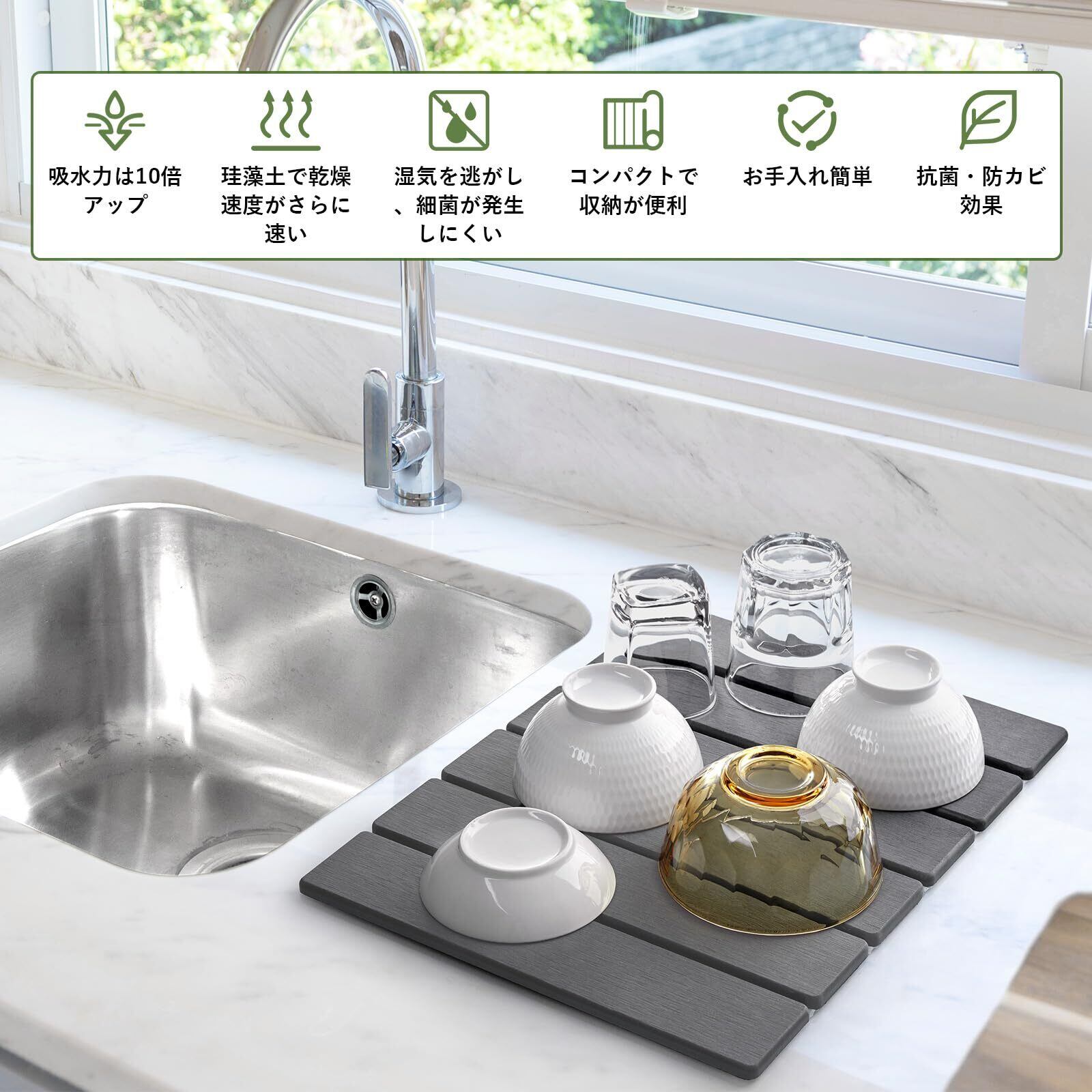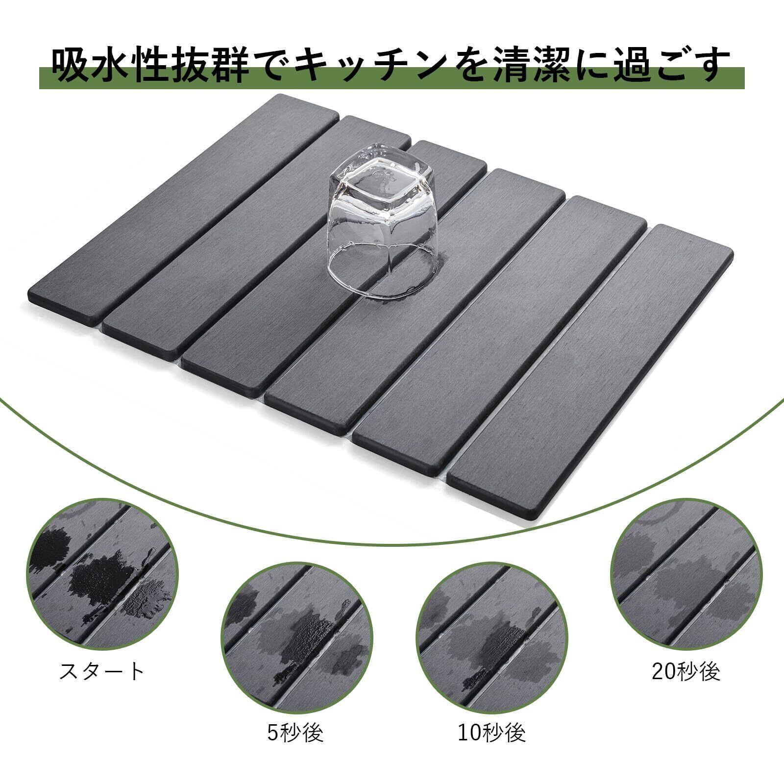 『吸水性抜群でキッチンを清潔に保つ』 水切りマット珪藻土 の優れた吸水性により、食器や鍋を置いた瞬間から水を素早く吸収し、食器 シンクマット キッチン台を常に乾燥・清潔に保ちます。食器 水切りマット より水滴の跡も残りにくく、快適な使用感を提供します。
