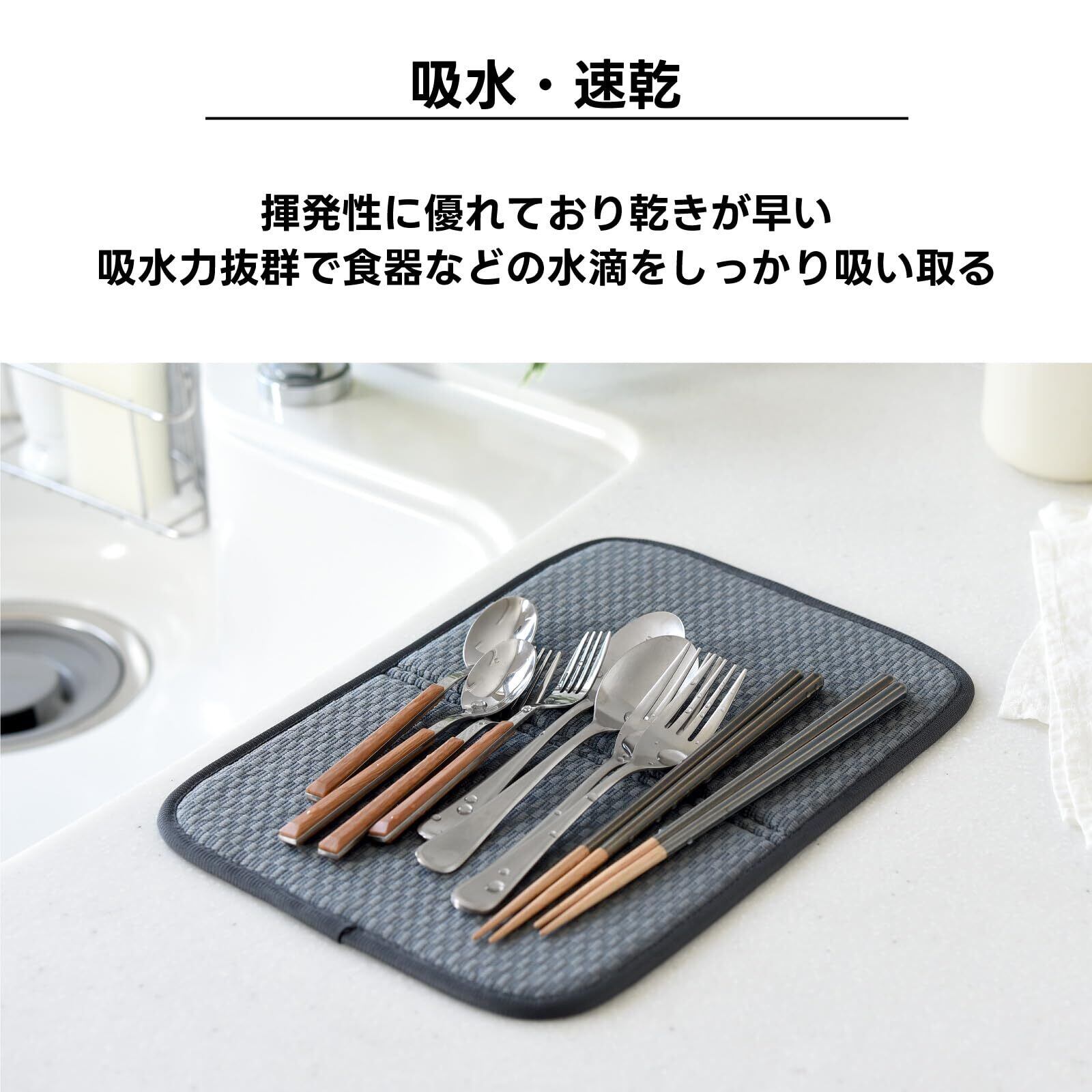 【吸水・速乾】厚手で食器類の水切りだけでなく水ハネで濡れたキッチン作業台の拭き取りにも吸水力を発揮します。揮発性に優れ乾きが早いです。