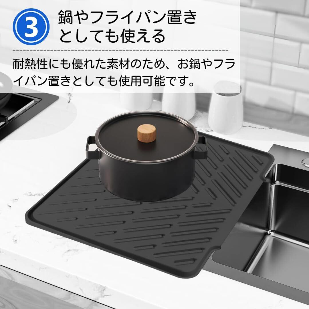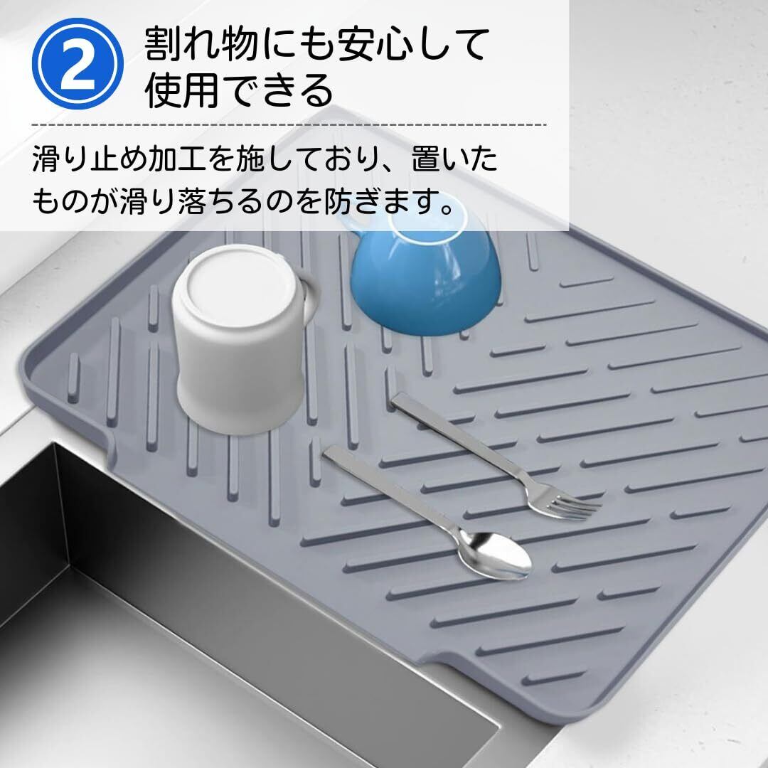 【清潔さをキープできるシンクマット】立体的な凹凸が通気を促し、食器類がすぐに乾きます。さらに傾斜と排水路で水滴をシンクに流し、カウンターの水ジミも防止できます。【熱にもズレにも強い】滑り止め加工で、食器や野菜、果物、ガラス製品がずれ落ちるのを防ぎます。さらに、-5℃から230℃までの耐熱性もあります。【毎日使用するのに最適な素材】耐久性に優れ変形しにくい素材でありながら、柔軟性も兼ね備えているため使いやすく、長期間の使用にも最適です。【簡単お手入れでいつも清潔】水で丸洗いでき、洗った後は吊り下げ用の穴で壁にかけて乾燥できるため、衛生的に保てます。【サイズ】縦=31cm×横=40cm 厚さ=1.8cm 【カラーバリエーション】・ブラック・グレー