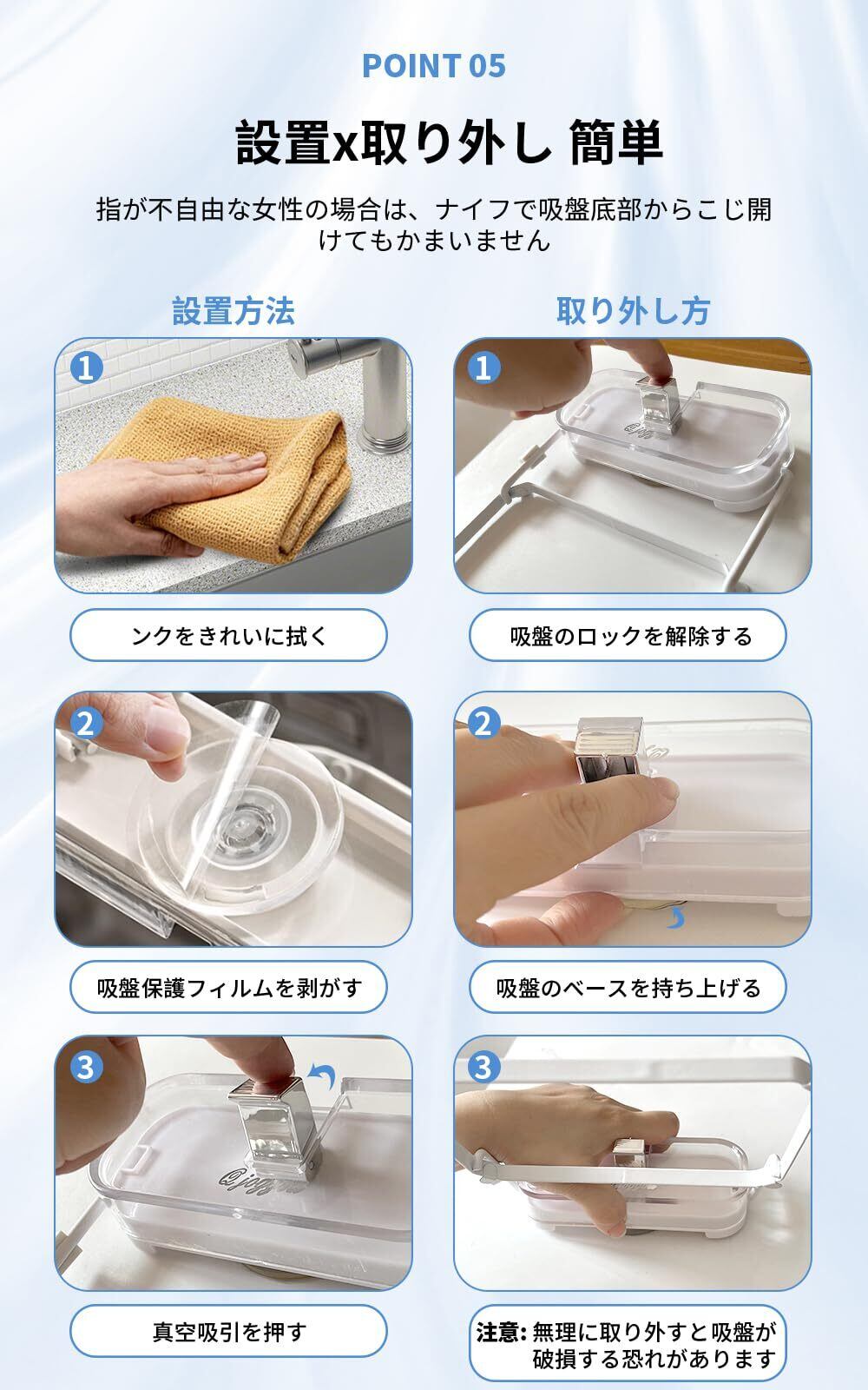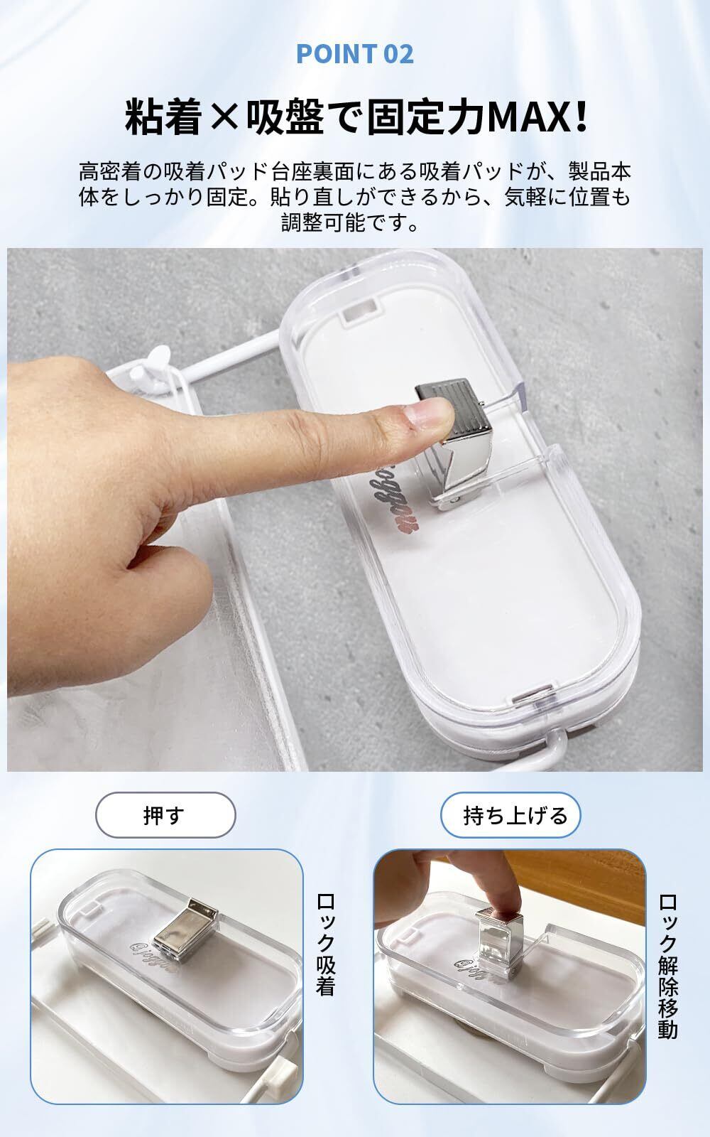 【強力吸盤設計】強力な吸盤を採用しておりますので、ズレることがございません。成人男性が揺すっても外れないほどの安定性を実現しております。高密着の「吸着パッド+陰圧ボタン」により、驚異的な密着力を実現いたしました。何度でも貼り直しが可能で、水洗いをしていただくことで清潔さと粘着力が復活いたします。