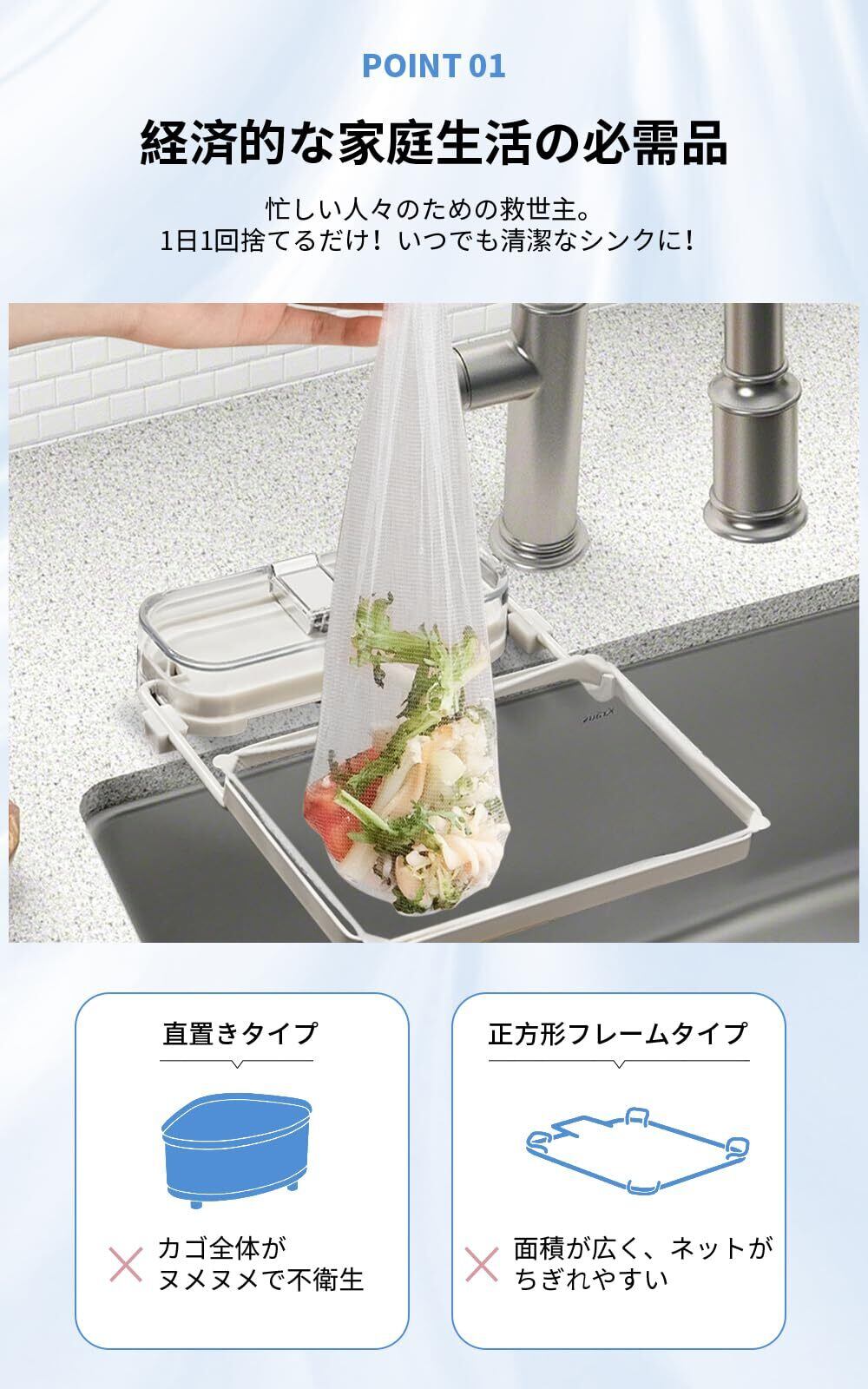 【水切りネット50枚付属】1日1回お捨ていただくだけで、いつでも清潔なシンクをお使いいただけます。ゴミ捨てはわずか3秒で完了いたしますので、汚れた部分に触れることなくお使いいただけます。ネットは引っ掛けるだけで簡単にセットできますので、必要な時にさっとご準備いただけます。