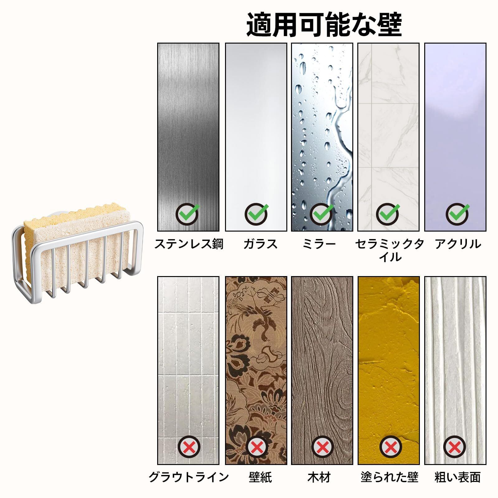 適用壁と暖かいヒント:吸盤式のスポンジラックはキッチン、シンク、冷蔵庫、洗濯機、バスルームなどあらゆるスムーズな壁面に吸着できて、利用便利なスポンジ置きラックです。スポンジホルダーは、金属、ガラス、タイル、ステンレス鋼、アクリルなどの滑らかで非多孔質の表面にのみ貼り付けられますが、凹凸のあるタイル、テクスチャプレート、未完成の大理石、壁紙、塗装された壁などには貼り付けられません