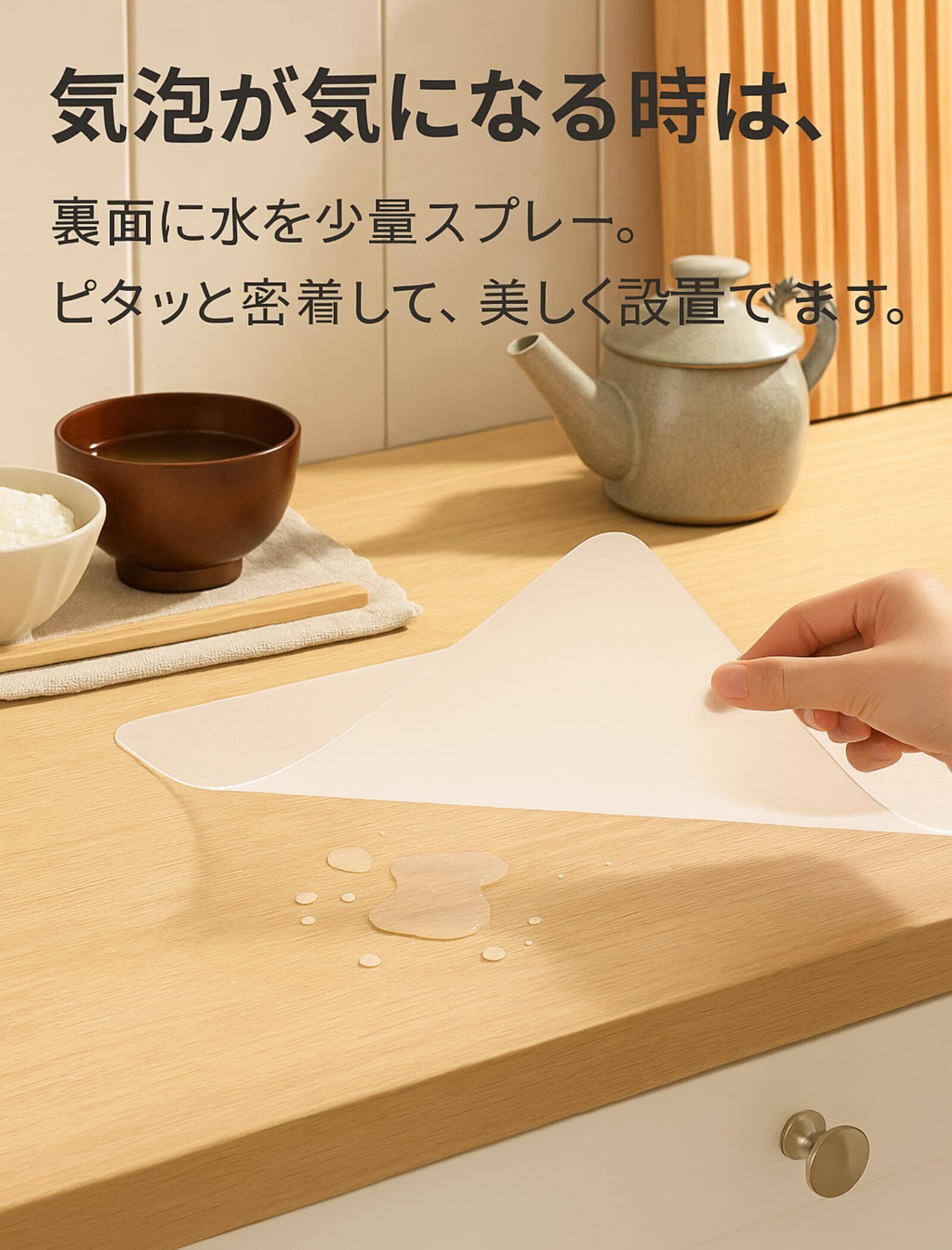 【気泡が気になるときは?|水を少し垂らすだけで解決】 設置時に気泡が入った場合は、少量の水をマット下に垂らすと吸着力が安定し、気泡も自然に消えていきます。