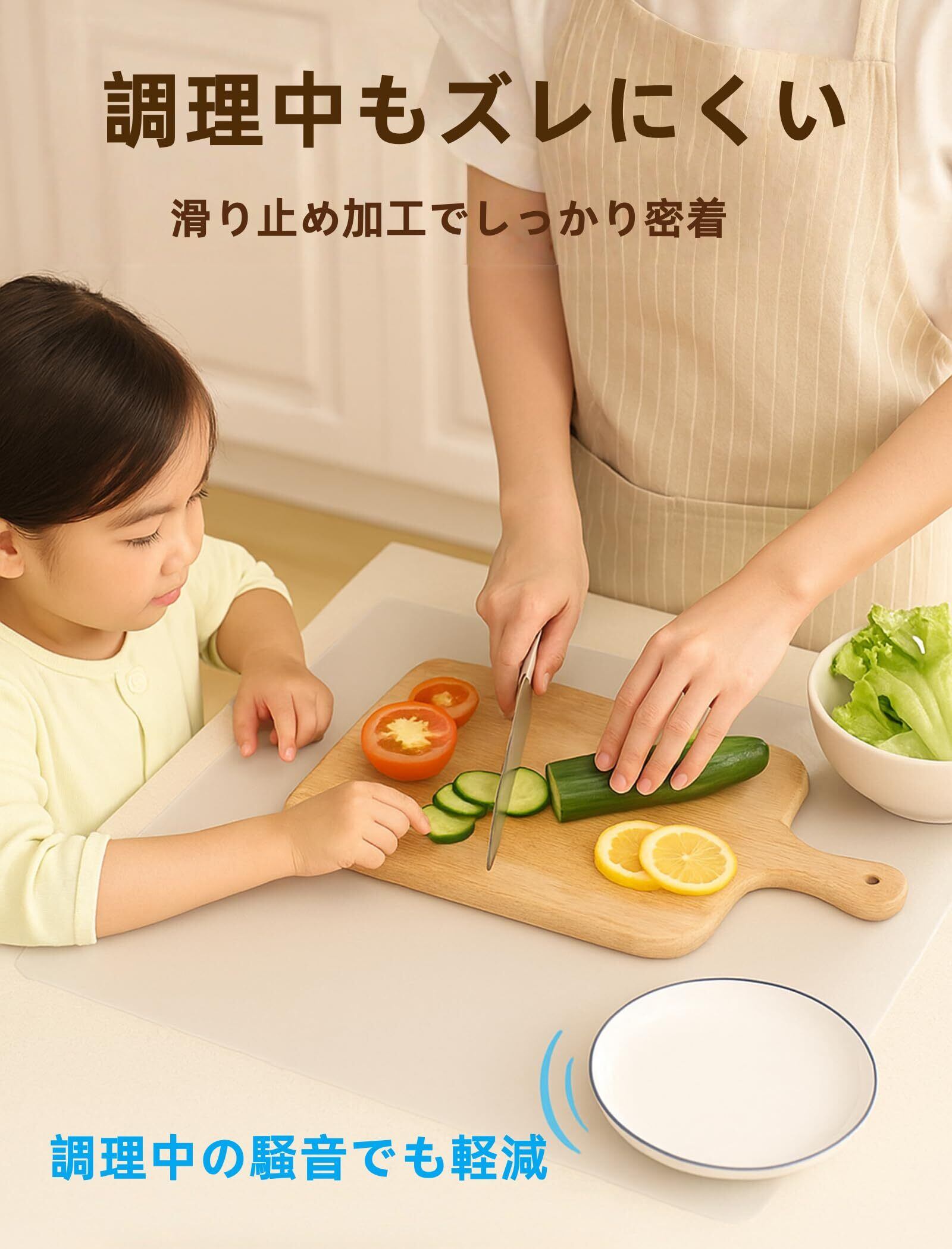 【調理中のズレを防止|滑り止め加工でピタッと密着】 裏面はテーブルや作業台にしっかり吸着する滑り止め仕様。まな板やボウルが滑らず、安定した調理環境をサポートします。