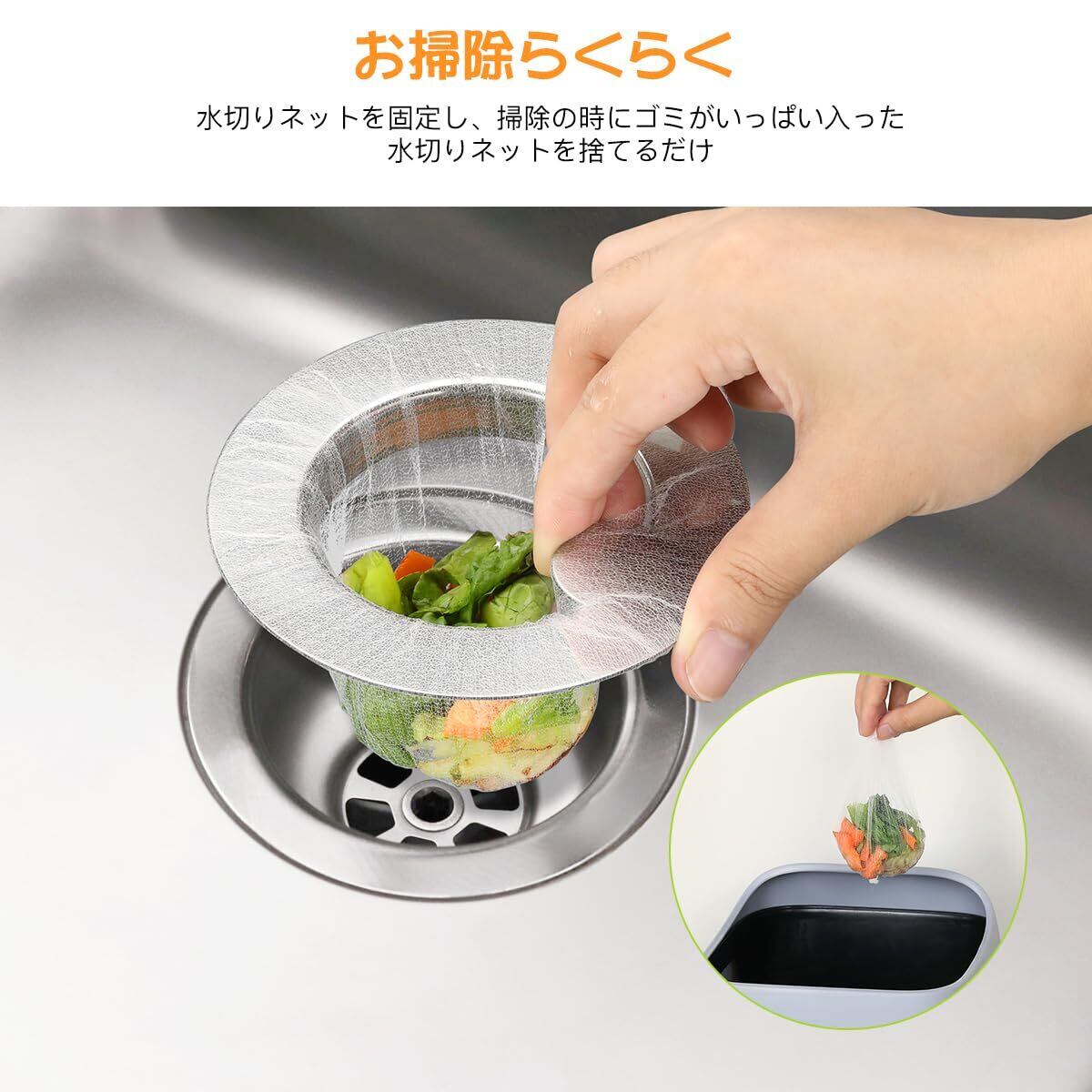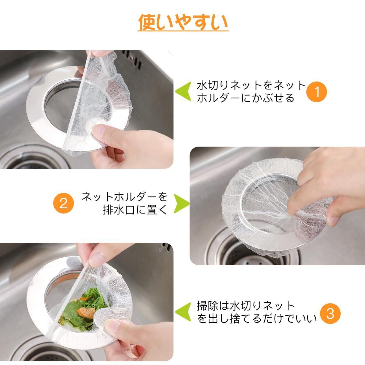 【掃除らくらく】キッチン排水溝 ゴミ受けは、バスケットいらずに水切りネットを固定し、掃除の時にゴミがいっぱい入った水切りネットを捨てるだけです。日々の排水口カゴの掃除の手間が省け、汚れ取りのストレスが解消してくれます。