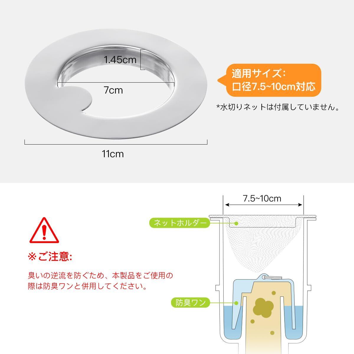 【商品仕様】適用サイズ:口径7.5~10cm対応、サイズ:外径11 cm x内径7cm x厚み1.5mm。※ご注意:1.水切りネットは付属していません。2.臭いの逆流を防ぐため、本製品をご使用の際は防臭ワンと併用してください。