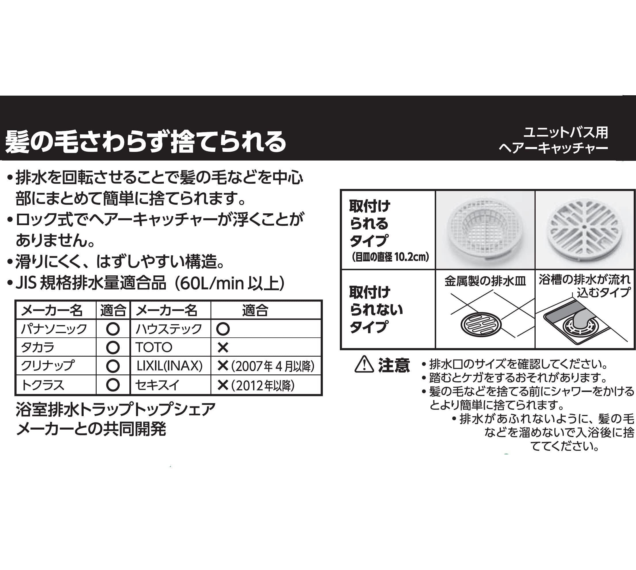 【注意】TOTO製の全機種、LIXIL(INAX)製の2007年4月以降、セキスイ製の2012年以降のユニットバスには適合しません。また、金属製の排水目皿や浴槽の排水が流れ込むタイプには適合いたしません。