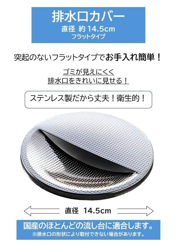 ステンレス製だから丈夫!衛生的!ゴミが見えにくく、排水口をきれいに隠せる!突起のないフラットタイプでお手入れ簡単!国産のほとんどの流し台に適合します。※排水口の形状により取付できない場合があります。