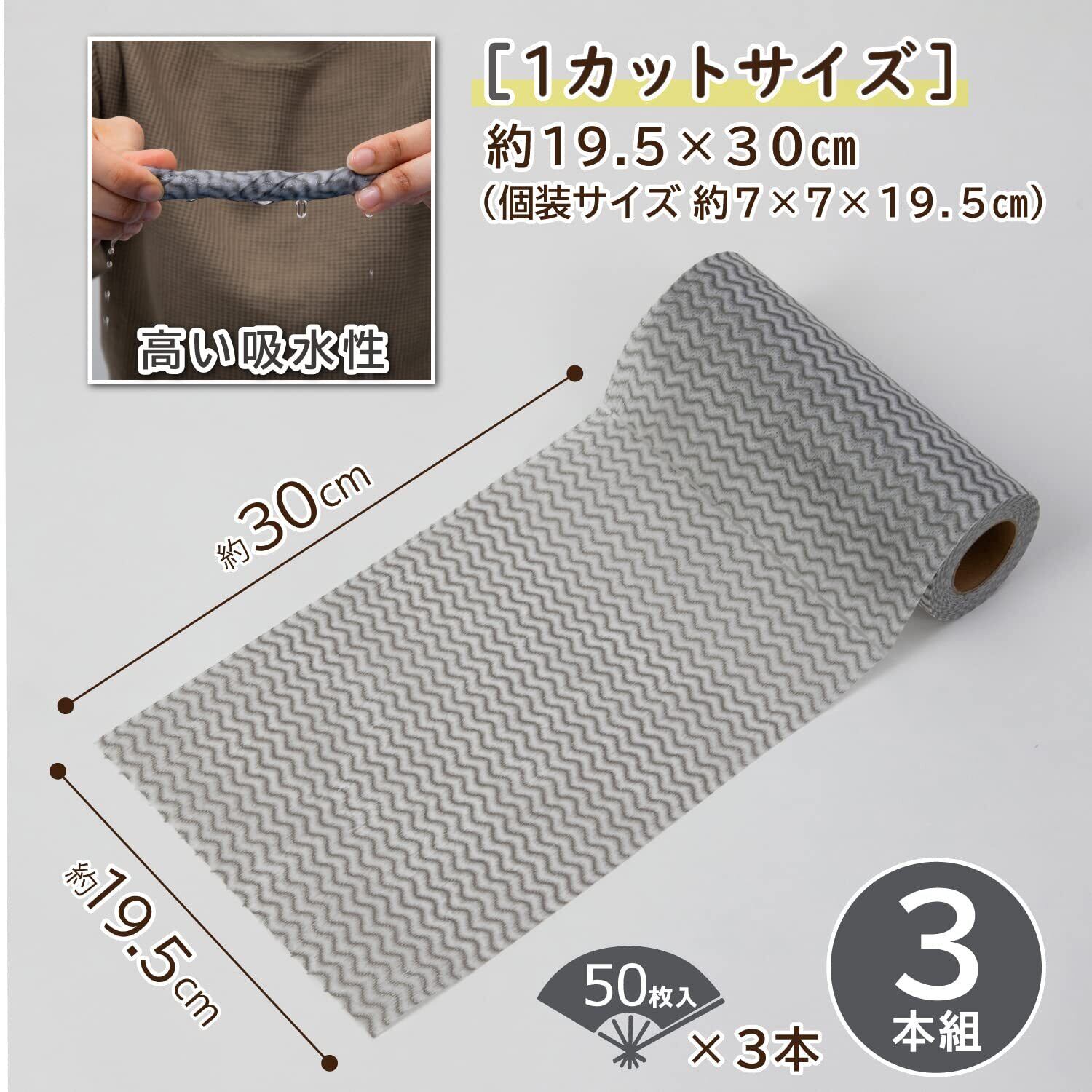 【商品仕様】:サイズ/[1本]約7×7×19.5cm・[1カット(枚)]約19.5×30cm、内容/3本(1本50カット・150枚分)、カラー/グレー、材質/ポリエステル
