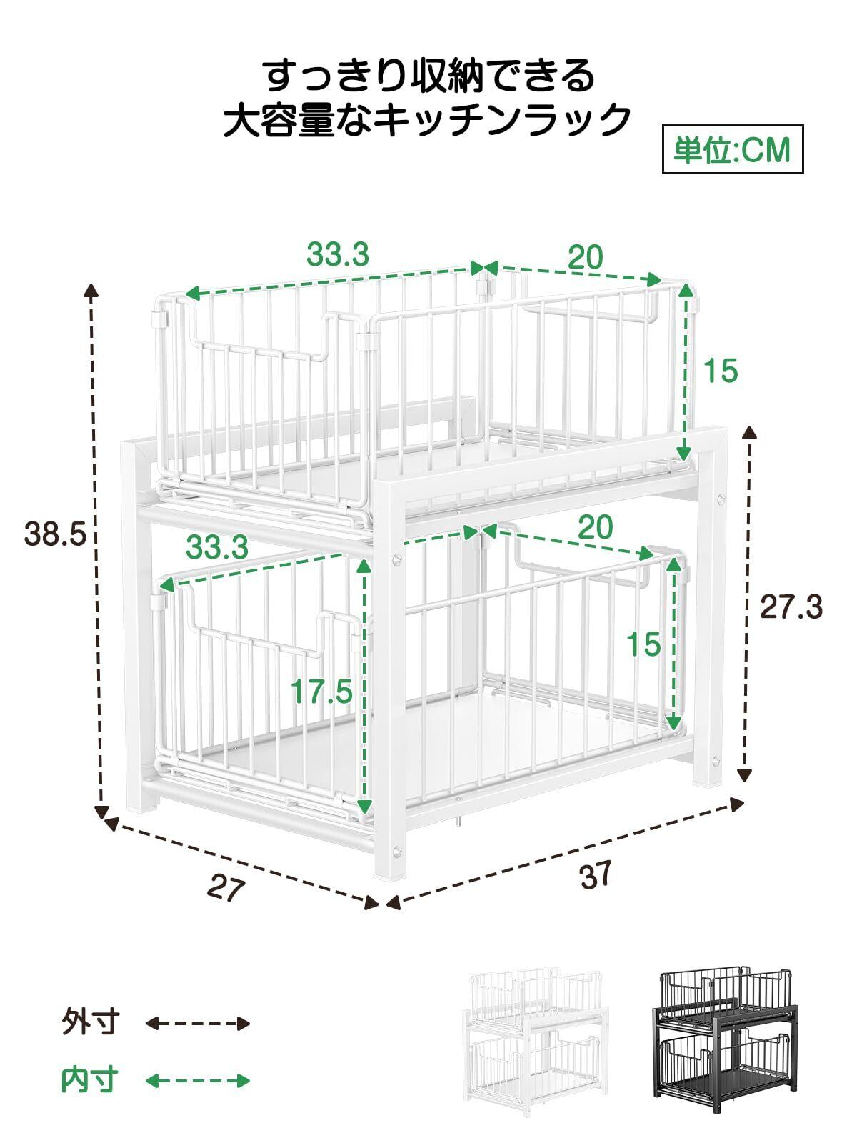 【シンク下 収納 スライド商品仕様】サイズ全体:幅27×奥行37×高さ38.5cm 引き出し×2(内寸):幅20cm×奥行33.3cm×高さ15m 上段から下段:17.5cm/材質:フレーム・引き出し・パイプ :炭素鋼/重量:約2.2kg/2色展開:ホワイト/ブラック/耐荷重:引き出し一個約15Kg 総耐荷重30Kg