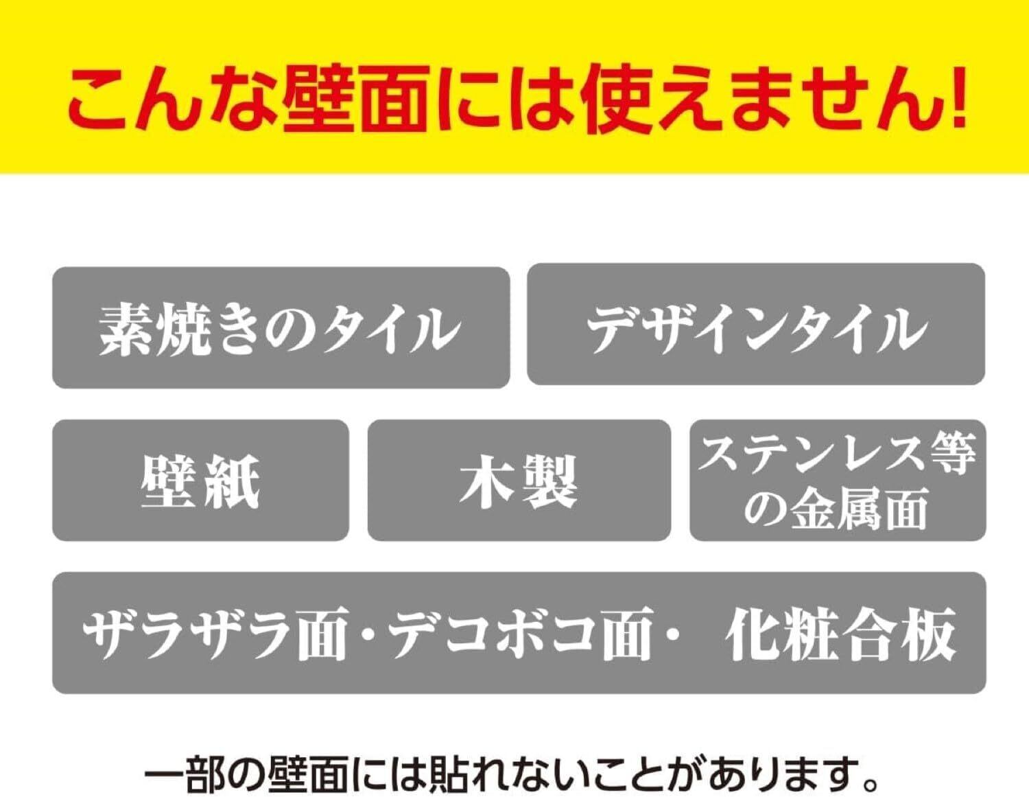 【使用不可の壁面】素焼きのタイル、デザインタイル、壁紙、木製、土壁等のザラザラ面やデコボコ面。 化粧合板 ※一部の壁面には貼れないことがあります