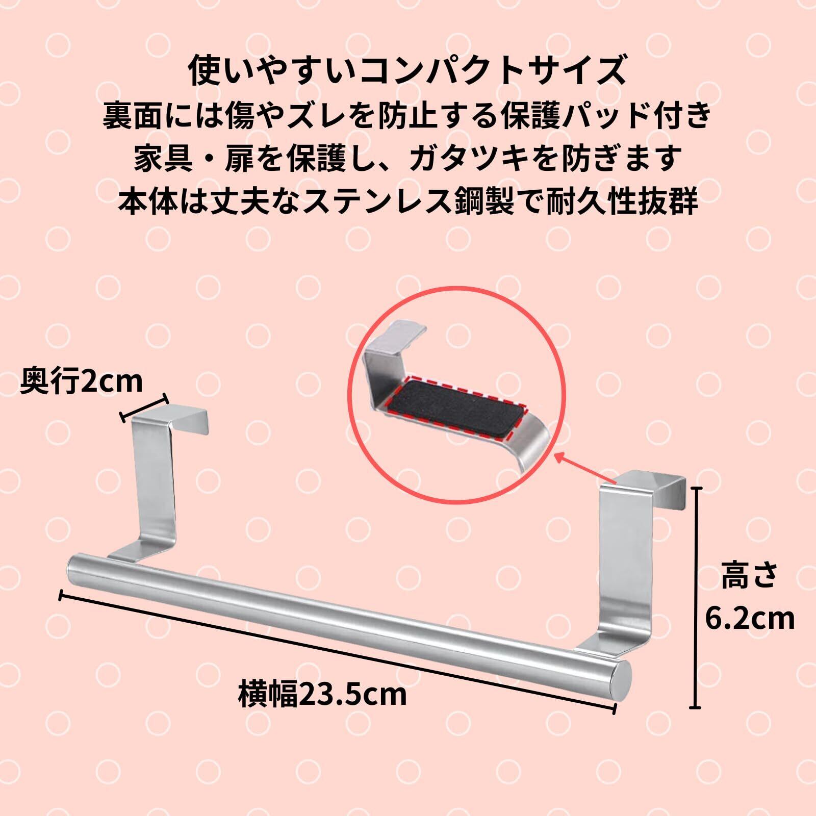 キッチンや洗面所に新たな収納スペースを作り出す、簡単取り付けのタオルバーです。穴あけ不要で、扉に引っ掛けるだけの手軽さが魅力。おしゃれなステンレスデザインは空間をすっきり見せ、インテリアにも調和します。 ステンレス製なので錆びにくく、水回りでの使用にも最適。フック部分にはクッションが付いており、扉や家具を傷つける心配もありません。キッチンや洗面所だけでなく、オフィスやアウトドアでも使える万能アイテムです。 さらに、扉の内側に取り付ければキッチンツールの収納に、外側に取り付ければタオルや手袋掛けとしても活用可能。吸盤式のタオル掛けが落ちやすいという悩みを解消し、しっかり固定できる安心感を提供します。 【サイズ】6.2cm×23.5cm 【フック設置適応サイズ】約2cm以下 【重量】約72g