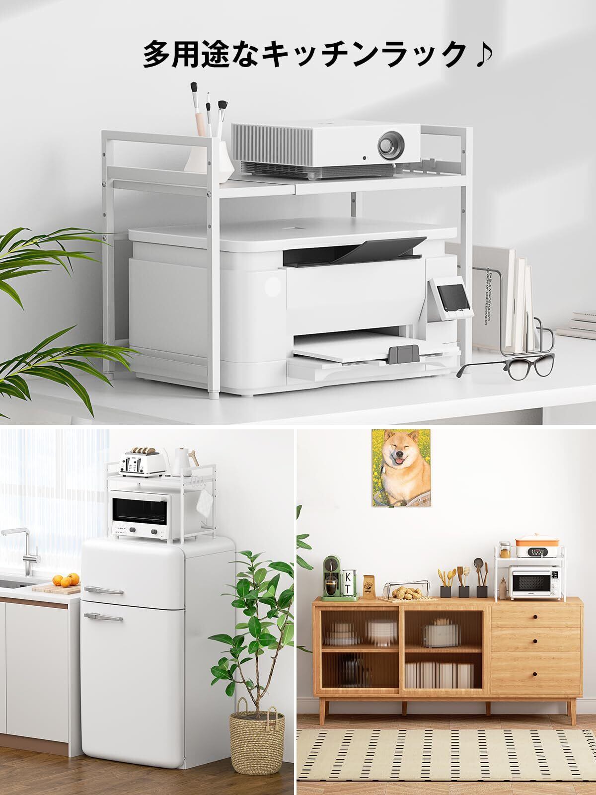 【様々なシーンに対応】キッチンラックとしてはもちろん、電子レンジ、炊飯器、オーブン等のキッチン小家電を放置する同時に、調味料、食用油、食器等のキッチン用品も勝手に収納できます。事務所プリンターラックとしても使える、プリンター、電話、書類、ホッチキス等事務用品を収納できます。寝室、居間、浴室の収納棚として、雑貨を置くことができます。空間をすっきりさせる多機能収納ラックです。