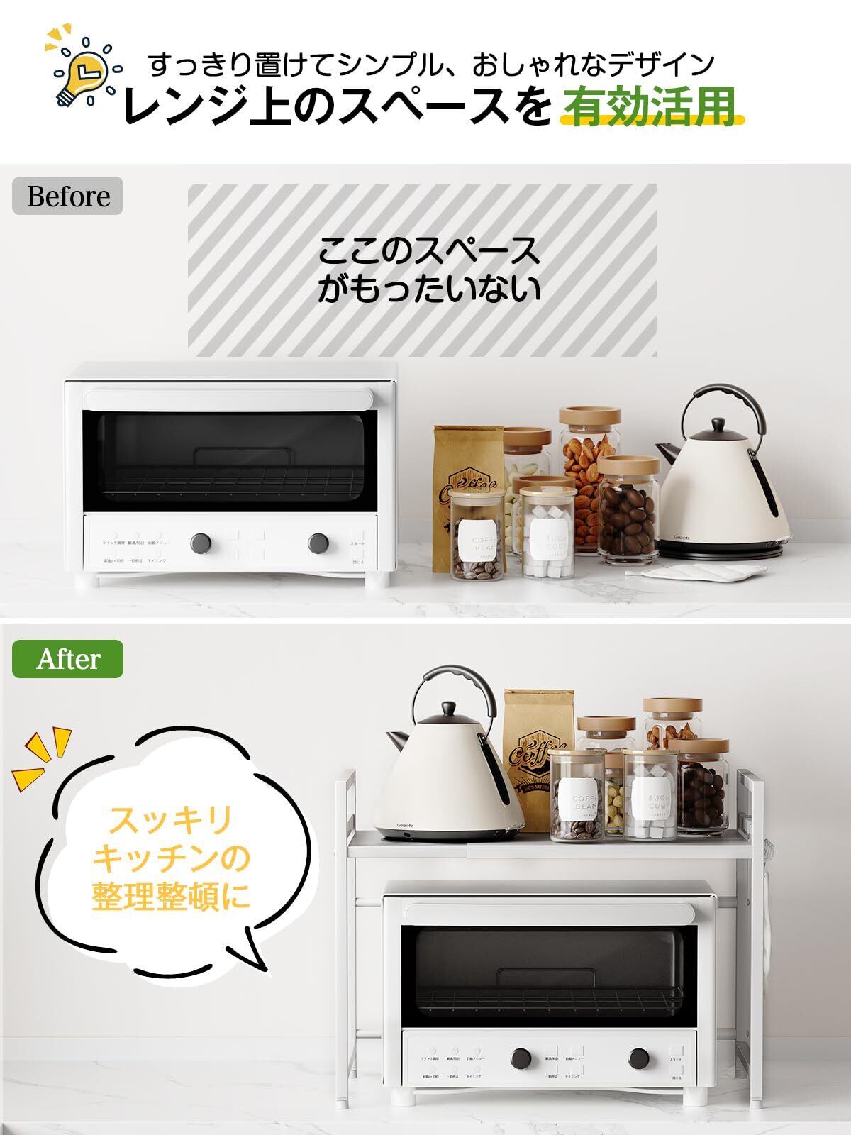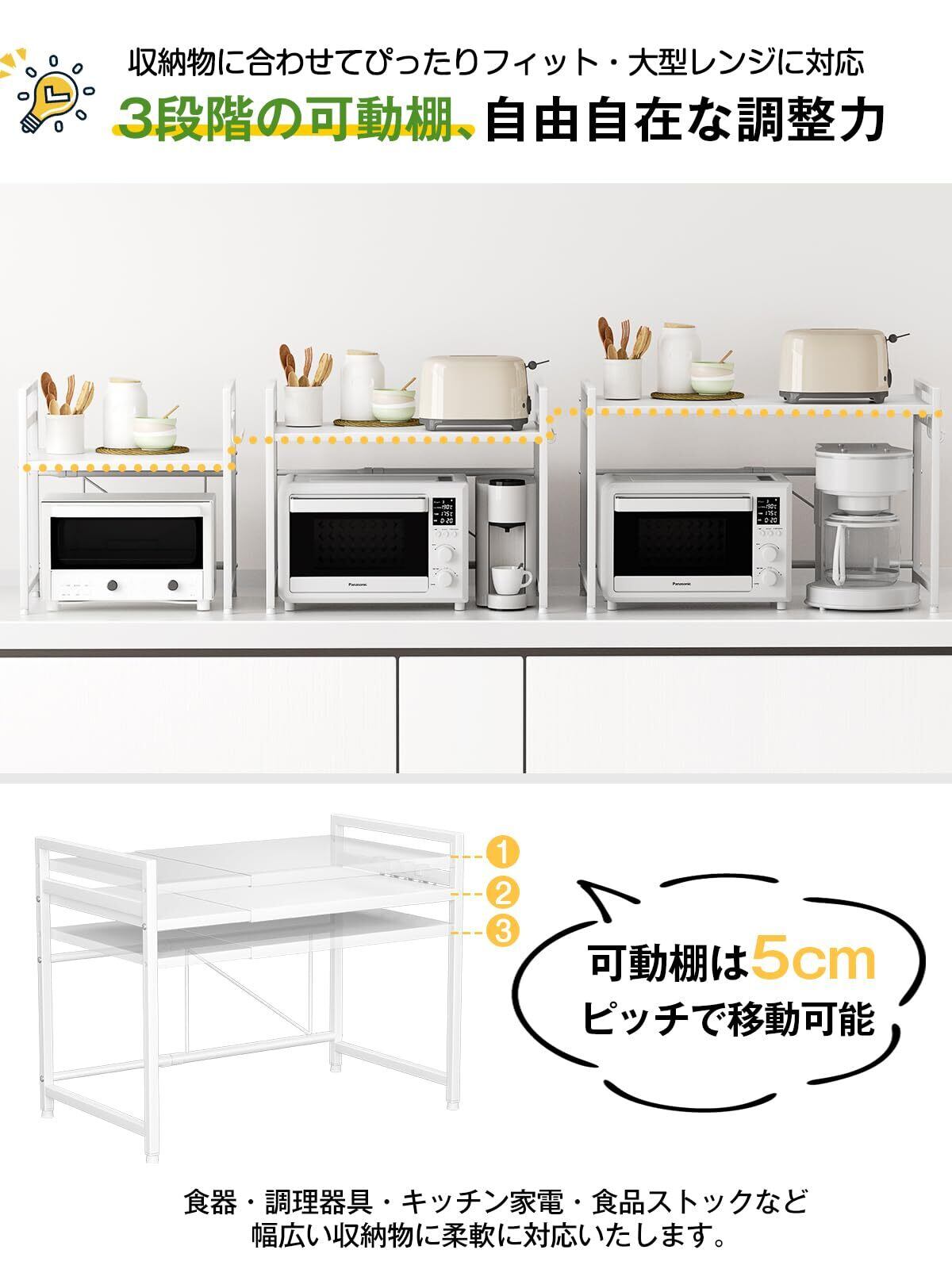 TKUIN レンジ上ラック キッチン 伸縮式 トースターラック 幅(39-65cm) 伸縮可 オーブンレンジ 棚板高さ調節可 電子レンジ 台 収納 耐荷重50kg フック4つ付き 組み立て簡単 おしゃれ (ホワイト)